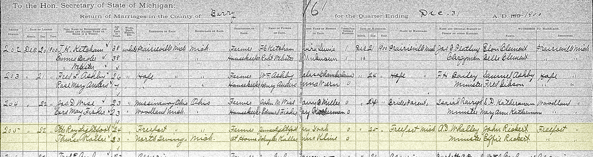 1 "Michigan Marriages, 1868-1925," database with images, FamilySearch (accessed 17 January 2021), (https://www.familysearch.org/ark:/61903/1:1:N3F8-MJX : 9 November 2020), Otto Ray Lightfoot and Thursa Kollar, 25 Dec 1900; citing Marriage, Freeport, Barry, Michigan, Citing Secretary of State, Department of Vital Records, Lansing; FHL microfilm 4208640.