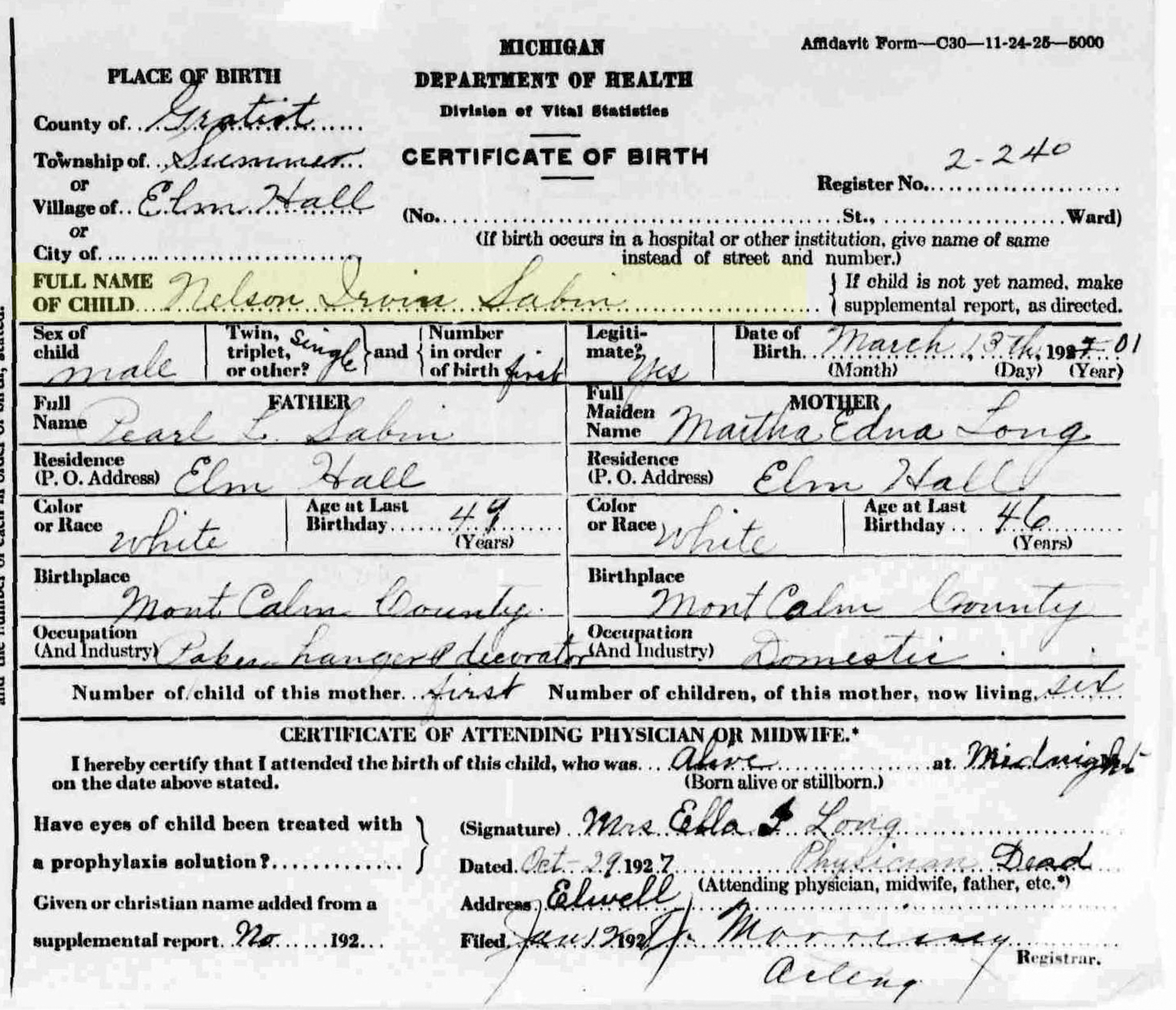 4 Find A Grave, database and images (https://www.findagrave.com/ ); accessed 01 July 2019), memorial page for Nelson Irvin Sabin (13 Mar 1901\endash 28 Sep 1977), Find A Grave Memorial no. 40858551, citing Elm Hall Cemetery, Elm Hall, Gratiot County, Michigan, USA