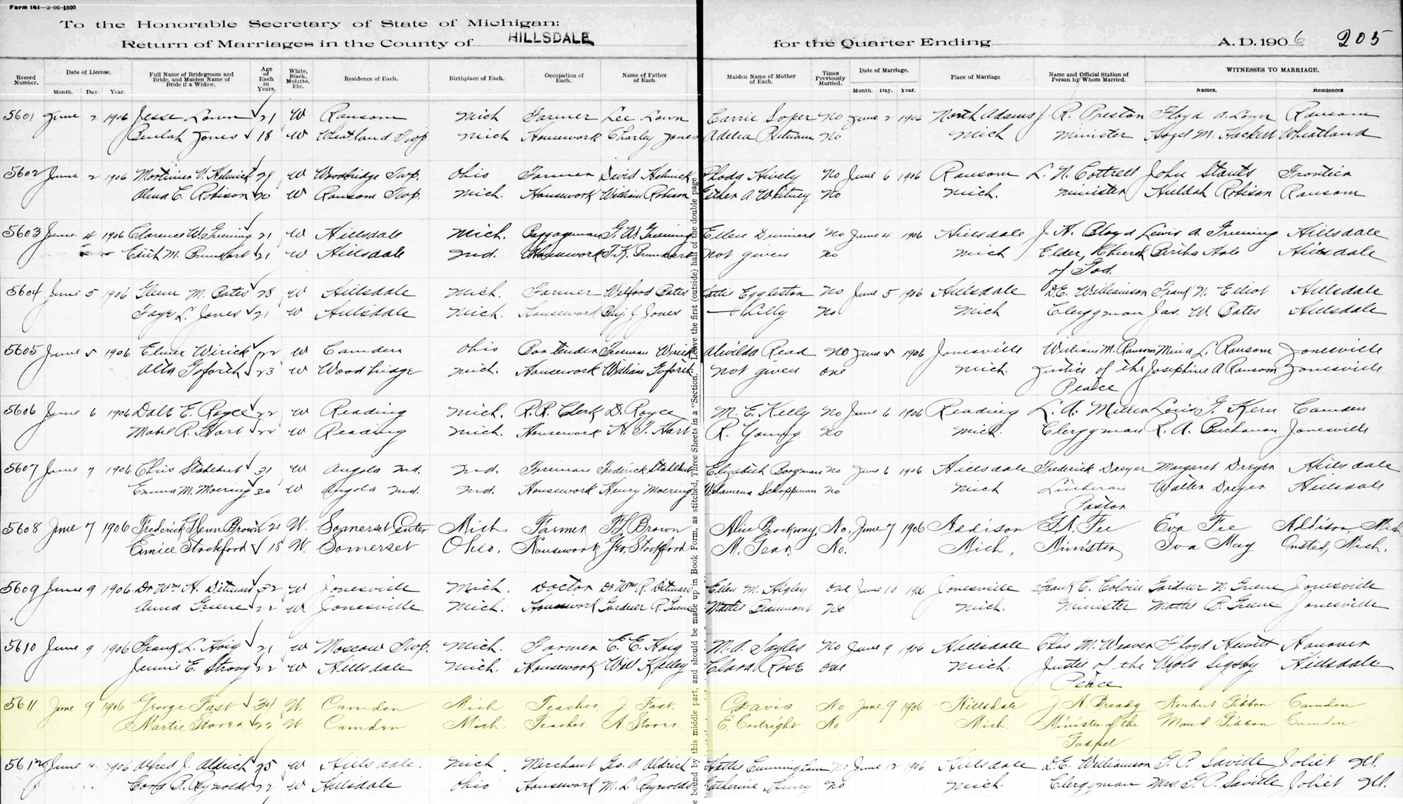 • Marriage Image: 9 June 1906, in Hillsdale, MI. 1 • They appeared on the 1920 US Census in Jonesville, MI on 9 January 1920. 2