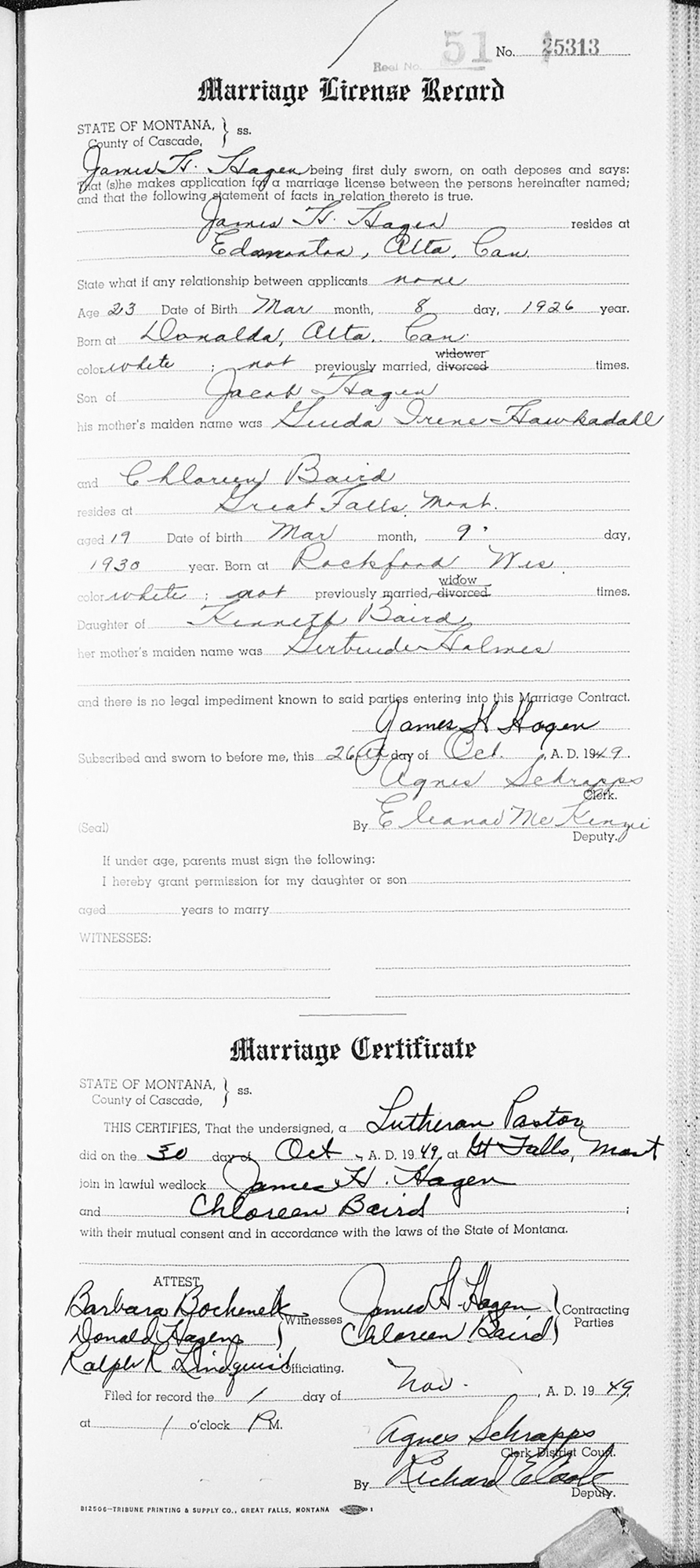 1 "Montana, County Marriages, 1865-1950," database with images, FamilySearch (https://familysearch.org/search/collection/1609797 : accessed 22 Mar 2020); James H. Hagen and Chloreen Baird, 30 Oct 1949; citing Marriage, Great Falls, Cascade, Montana, various county courthouses, Montana; FHL microfilm 1,940,304.