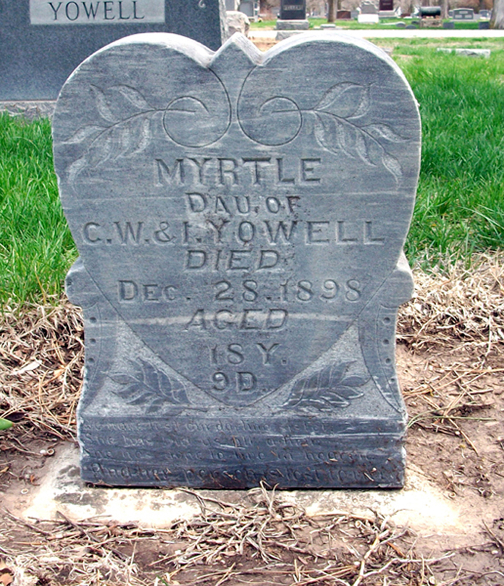 Find A Grave, database and images (https://www.findagrave.com/ ); (accessed 14 August 2019), memorial page for Daisy Myrtle Yowell (19 Dec 1880\endash 28 Dec 1898), Find A Grave Memorial no. 54259769, citing McPherson Cemetery, McPherson, McPherson County, Kansas, USA