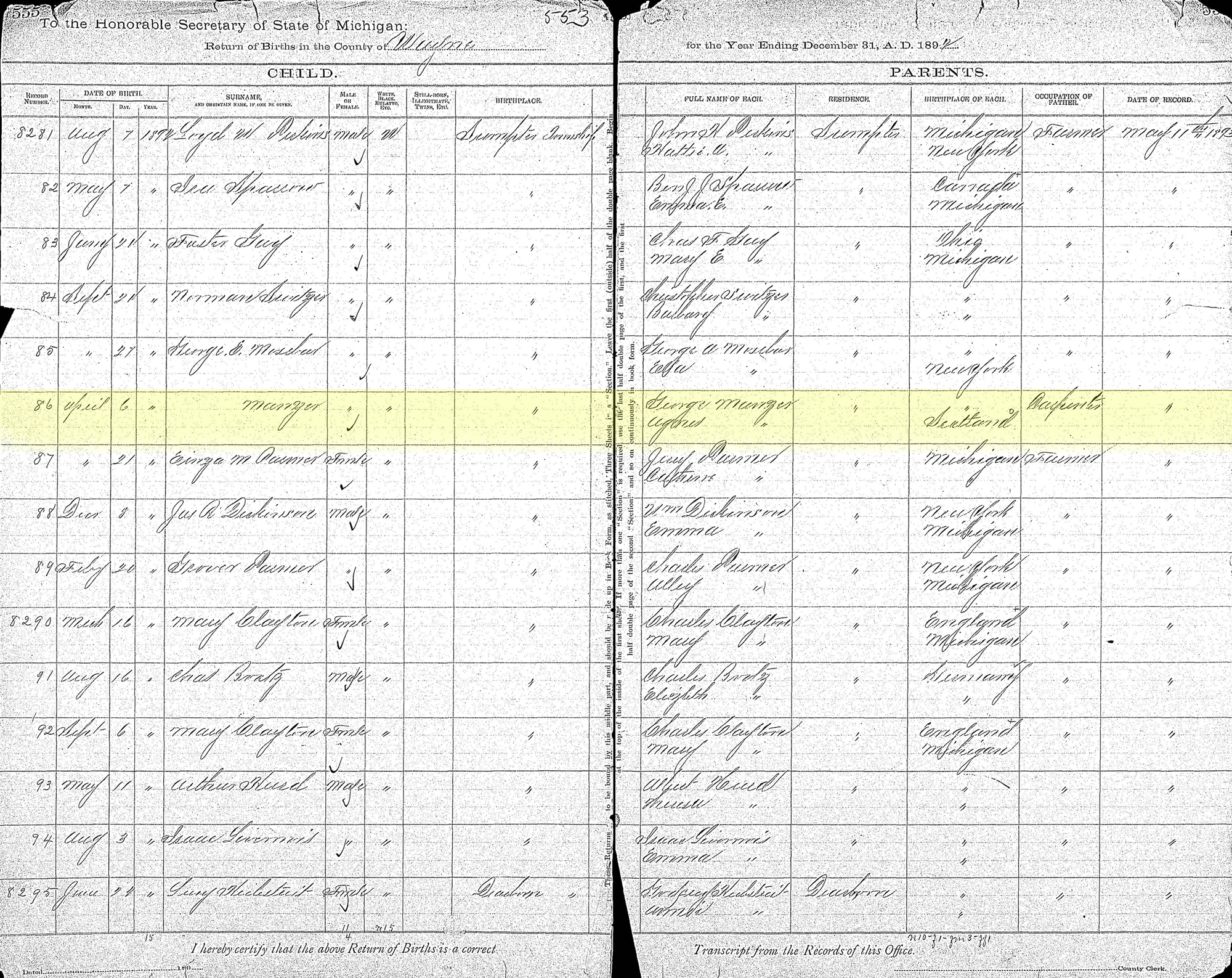 Name: Manzer Birth Date: 06 Apr 1892 Birthplace: Sumpter Township, Wayne, Michigan Gender: Male Father's Name: George Manzer Father's Birthplace: New York Mother's Name: Agnes Manzer Mother's Birthplace: Scotland Reference ID: item 1 p 555 rn 8286