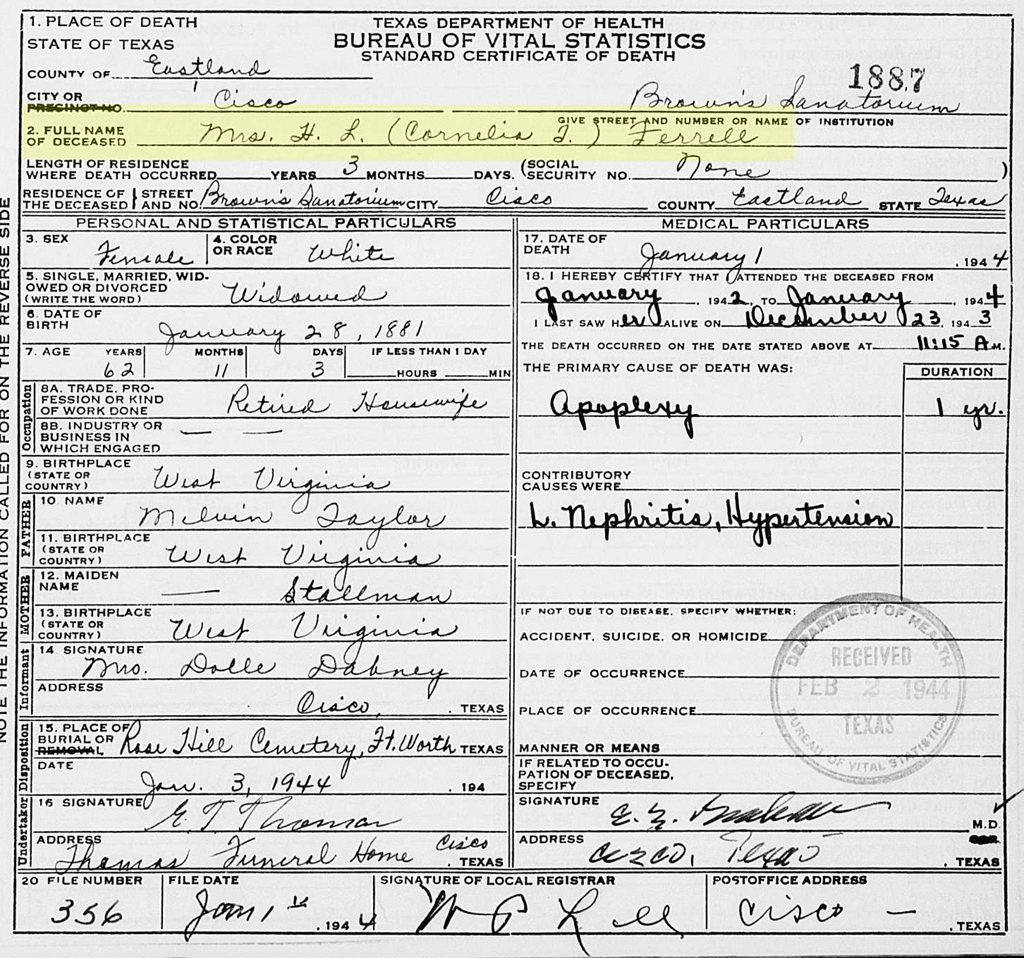 5 "Texas Deaths, 1890-1976," database with images, FamilySearch (https://familysearch.org/search/collection/1983324 : accessed 31 July 2021); (https://familysearch.org/ark:/61903/1:1:KSBG-2MR : 20 February 2021), Cornelia T Ferrell, 01 Jan 1944; citing certificate number 1887, State Registrar Office, Austin; FHL microfilm 2,137,701.