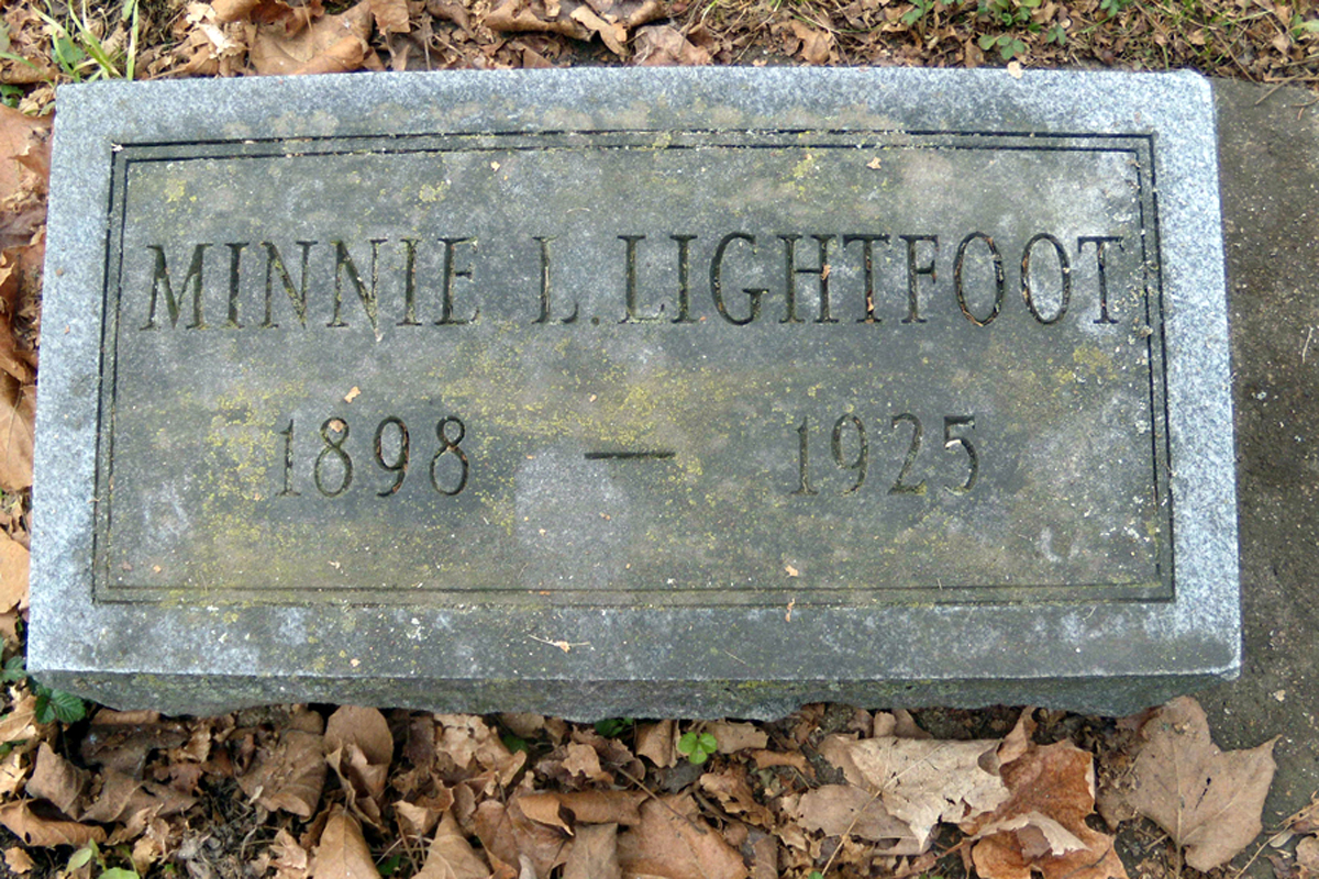 • She was buried after 23 June 1925 in the Freeport Cemetery in Freeport, MI. Minnie married Bernie Fay Lightfoot, son of King Millard Lightfoot and Lyda Johnson, on 21 June 1916 in Centreville, MI.1 2 3 (Bernie Fay Lightfoot was born on 26 November 1895 in Freeport, MI,1 2 3 4 6 7 8 9 died on 4 July 1975 in Freeport, MI 8 9 and was buried after 4 July 1975 in Freeport, MI 9.)