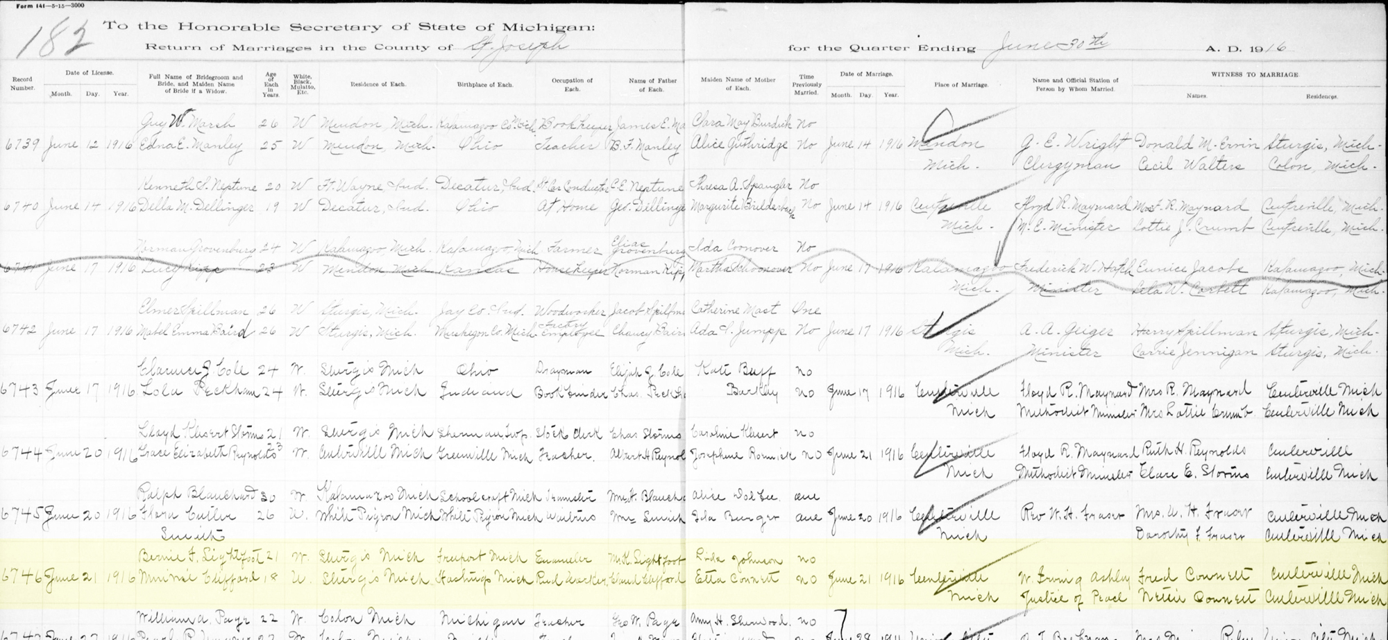 1 "Michigan Marriages, 1868-1925," database with images, FamilySearch (accessed 16 January 2021), (https://familysearch.org/ark:/61903/1:1:N353-8HW : 2 April 2020), Bernie F. Lightfoot and Minnie Clifford, 21 Jun 1916; citing Marriage, Centreville, St Joseph, Michigan, Citing Secretary of State, Department of Vital Records, Lansing; FHL microfilm 4209305.