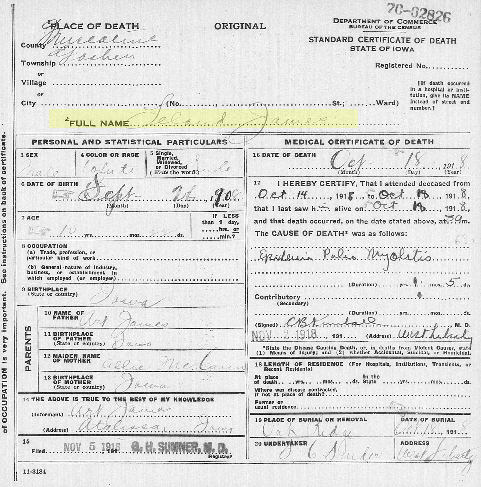 3 "Iowa, County Death Records, 1880-1992," database, FamilySearch (https://familysearch.org/search/collection/2110820 : accessed 3 January 2021), (https://familysearch.org/ark:/61903/1:1:QVMN-MFCS : 17 March 2018), Leland James, 18 Oct 1918; citing Death, Goshen, Muscatine, Iowa, United States, page 10, offices of county clerk from various counties; FHL microfilm 1,846,119.