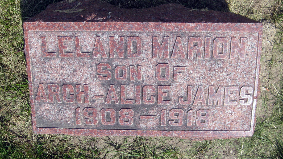 Find A Grave, database and images (https://www.findagrave.com/ ); Find a Grave, database and images (https://www.findagrave.com : accessed 03 January 2021), memorial page for Leland Marion James (25 Sep 1908\endash 18 Oct 1918), Find a Grave Memorial no. 125199747, citing Oak Ridge Cemetery, West Liberty, Muscatine County, Iowa, USA ; Maintained by Genie Lady (contributor 47043622) .