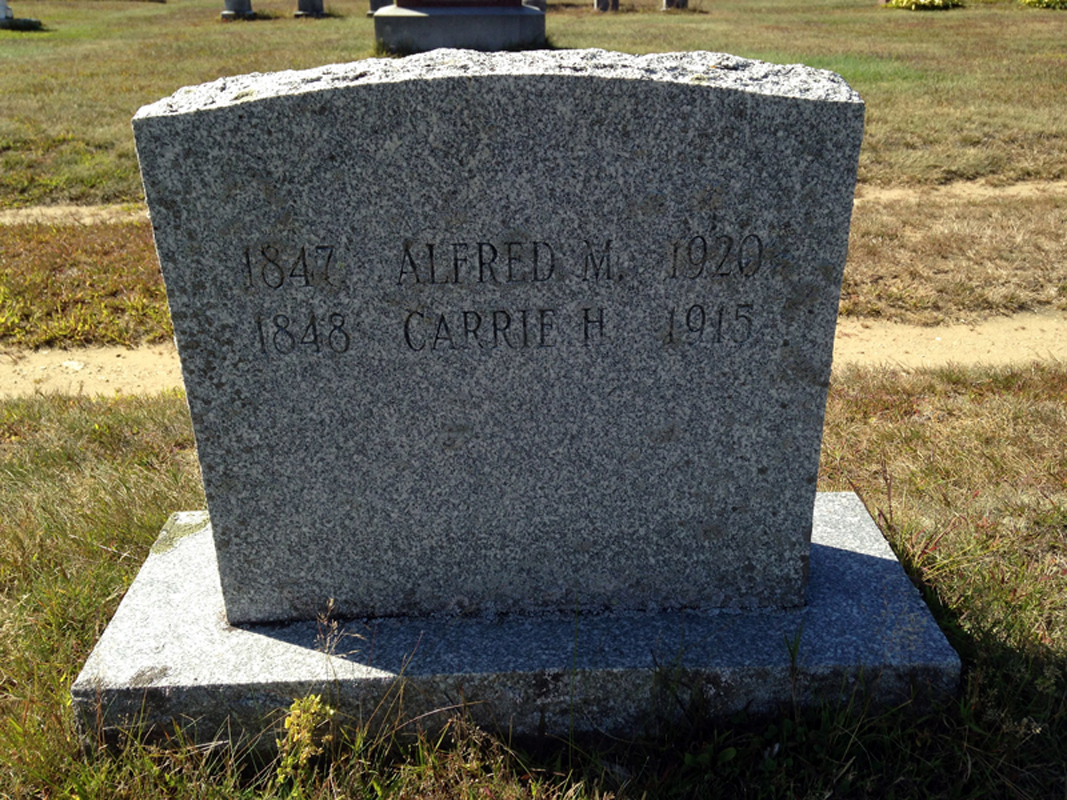 • He was buried in 1920 in the Union Cemetery in Laconia, NH. • He appeared on the 1920 US Census in Tilton, NH on 20 January 1920. 6 Alfred married Carrie E. Holmes, daughter of Leonard S. Holmes and Savalla Swett, on 17 February 1871 in Franklin, NH.1 2 3 4 (Carrie E. Holmes was born on 5 August 1848 in Salisbury, NH,3 5 8 9 died on 26 May 1916 in Tilton, NH 5 9 and was buried on 29 May 1916 in Laconia, NH 5 9.)