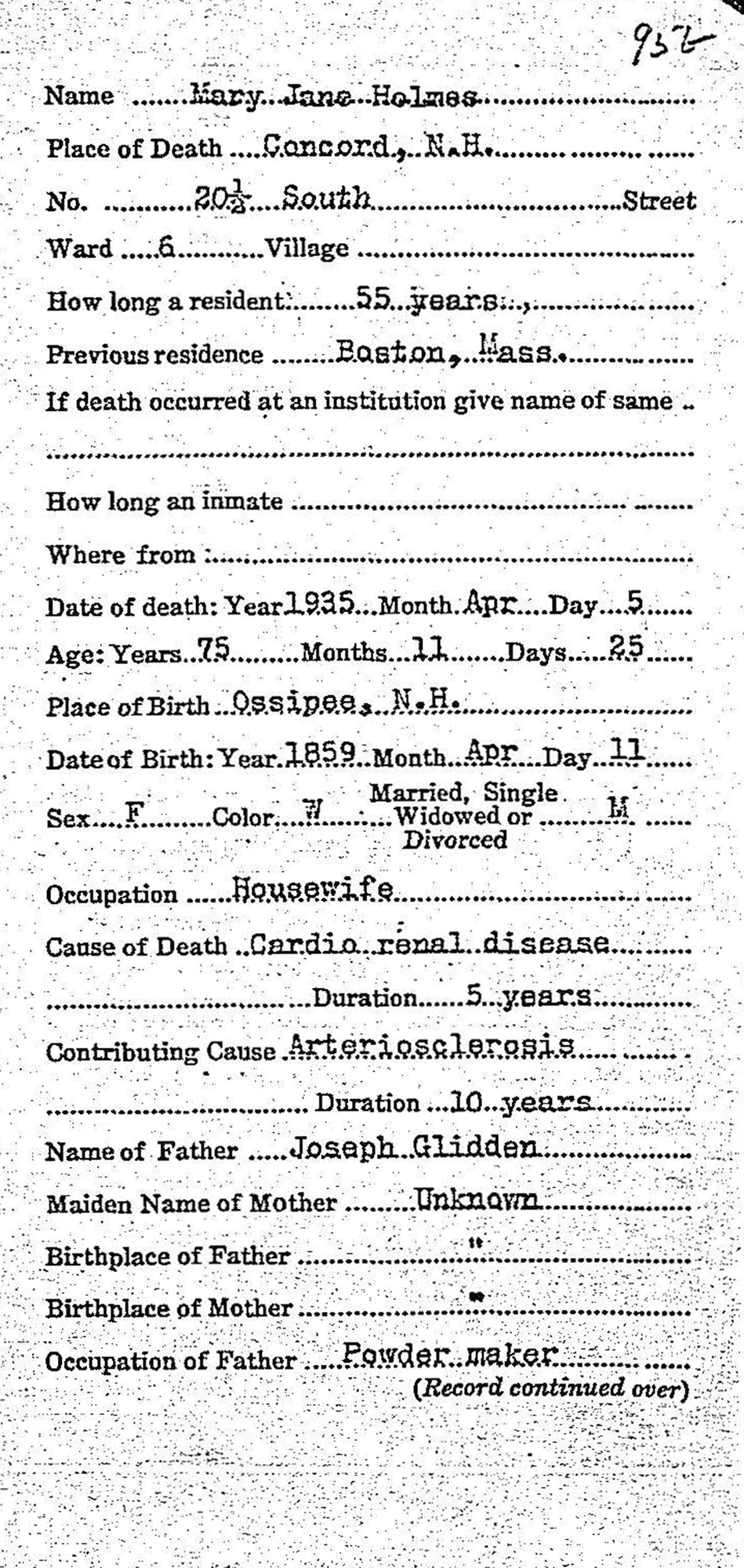 6 "New Hampshire Death Records, 1654-1947," database with images, FamilySearch (https://www.familysearch.org/search/collection/1601211 : accessed 24 Apr 2020), Mary Jane Holmes, 05 Apr 1935; citing Concord, Merrimack, New Hampshire, Bureau Vital Records and Health Statistics, Concord; FHL microfilm 2,080,189.