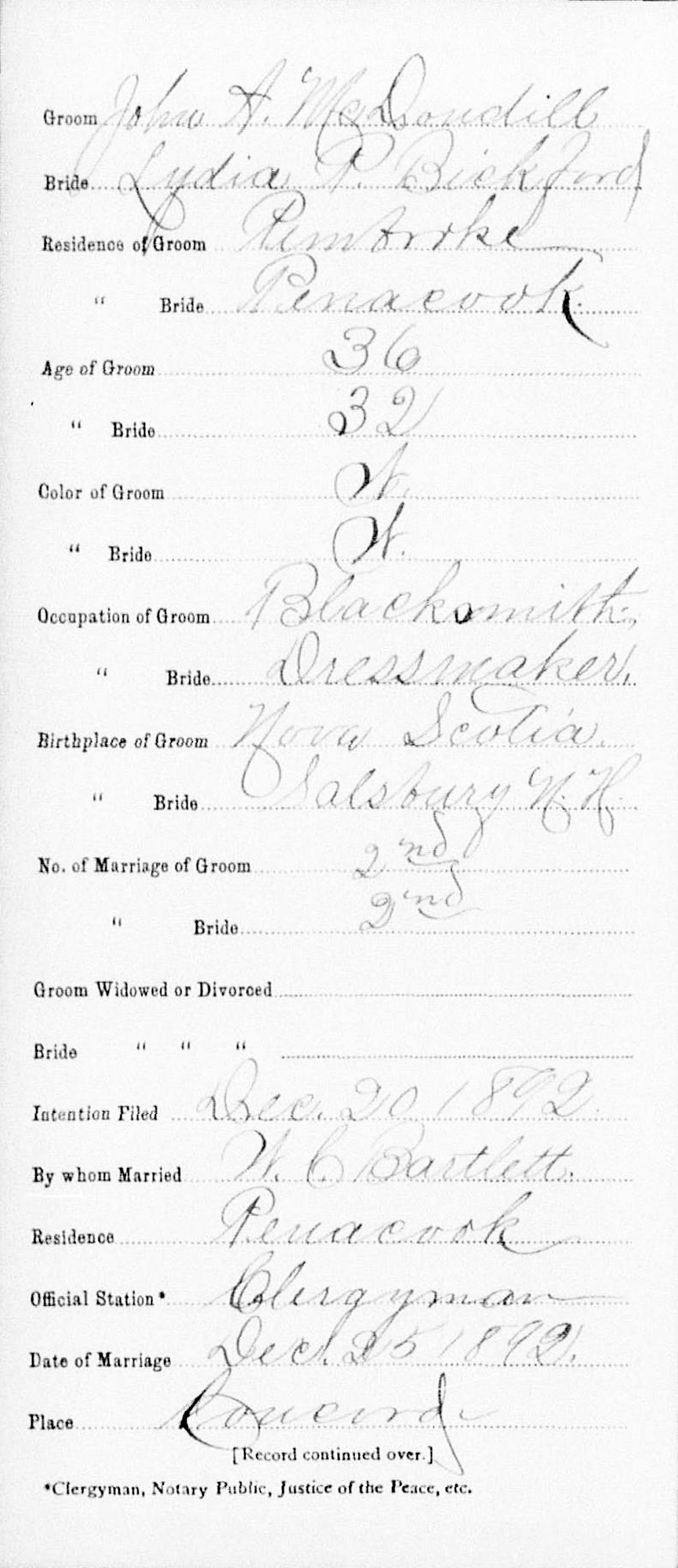 1 "New Hampshire Marriage Records, 1637-1947," database, FamilySearch (https://www.familysearch.org/search/collection/1520640 : accessed 19 Apr 2020), John A. Mcdondill and Lydia R. Bickford, 25 Dec 1892; citing Concord, Merrimack, New Hampshire, Bureau of Vital Records and Health Statistics, Concord; FHL microfilm 1,001,280.