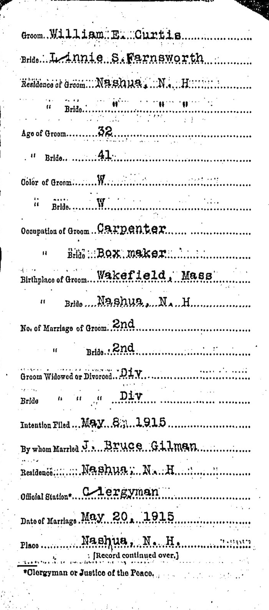 1 "New Hampshire Marriage Records, 1637-1947," database, FamilySearch (https://www.familysearch.org/search/collection/1520640 : accessed 11 Apr 2020), William E. Curtis and Linnie S. Farnsworth, 20 May 1915; citing Nashua, New Hampshire, Bureau of Vital Records and Health Statistics, Concord; FHL microfilm 2,057,761.