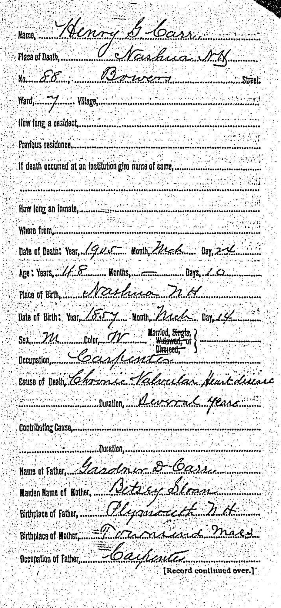 2 "New Hampshire Death Records, 1654-1947," database with images, FamilySearch (https://www.familysearch.org/search/collection/1601211 : accessed 12 Apr 2020), Henry G. Carr, 24 Mar 1905; citing Nashua, Hillsborough, New Hampshire, Bureau Vital Records and Health Statistics, Concord; FHL microfilm 2,078,969.