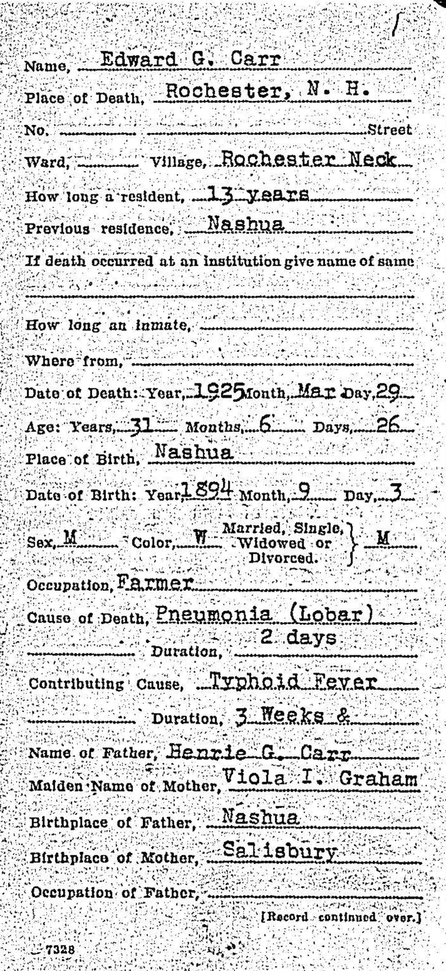 1 "New Hampshire Death Records, 1654-1947," database with images, FamilySearch (https://www.familysearch.org/search/collection/1601211 : accessed 12 Apr 2020), Edward G. Carr, 29 Mar 1925; citing Rochester, Strafford, New Hampshire, Bureau Vital Records and Health Statistics, Concord; FHL microfilm 2,078,969.
