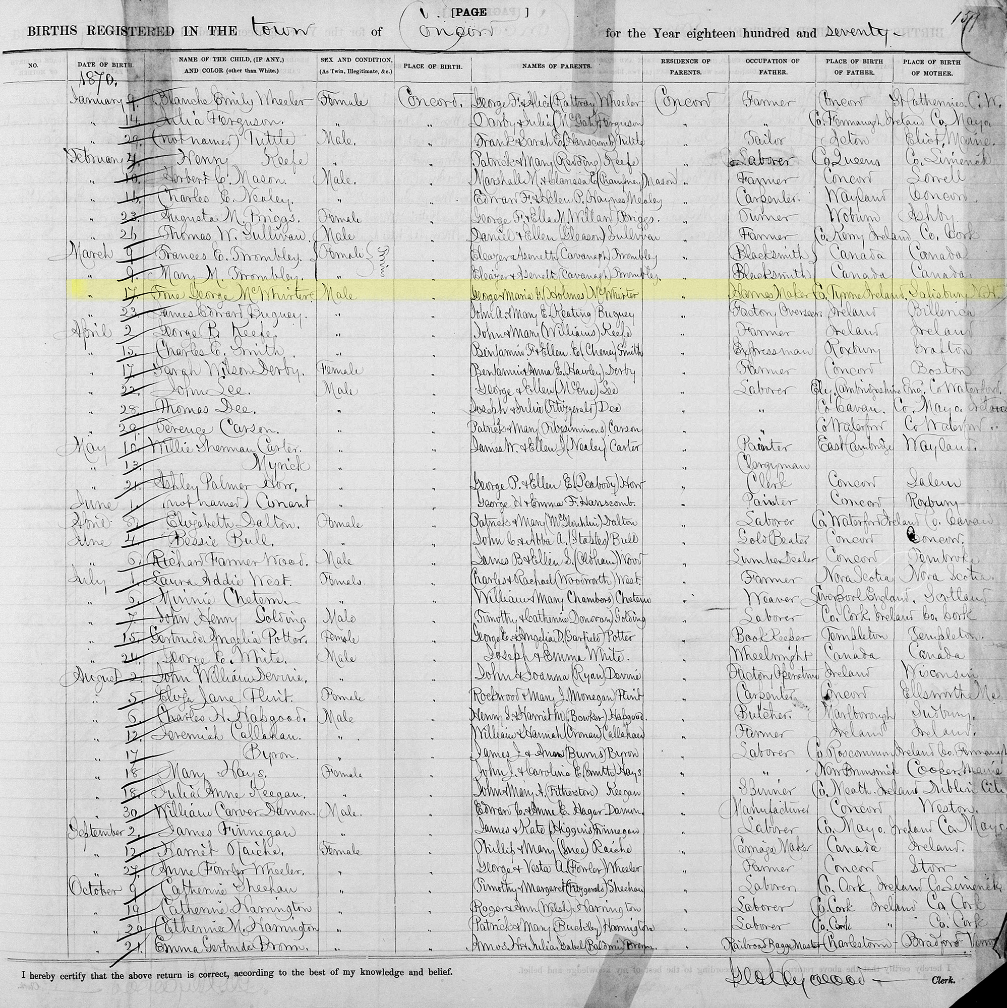 2 "Massachusetts Births, 1841-1915," database with images, FamilySearch (https://www.familysearch.org/search/collection/1536925 : accessed 13 Apr 2020), Onie George Mcwhirter, 17 Mar 1870, Concord, Massachusetts; citing reference ID #p 159, Massachusetts Archives, Boston; FHL microfilm 1,428,073.