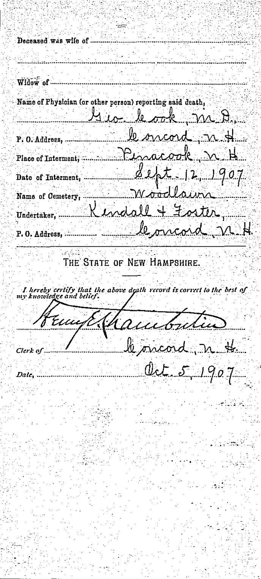 • Death Image: 10 September 1907, in Concord, NH. 4 • He was buried on 12 September 1907 in the Woodlawn in Penacook, NH. George married Elizabeth M. Keyes, daughter of Thomas Keyes and Sarah Whalen, on 21 October 1900 in Boston, MA.1 (Elizabeth M. Keyes was born in March 1872 in Newfoundland, CANADA 1 and died on an unknown date.)
