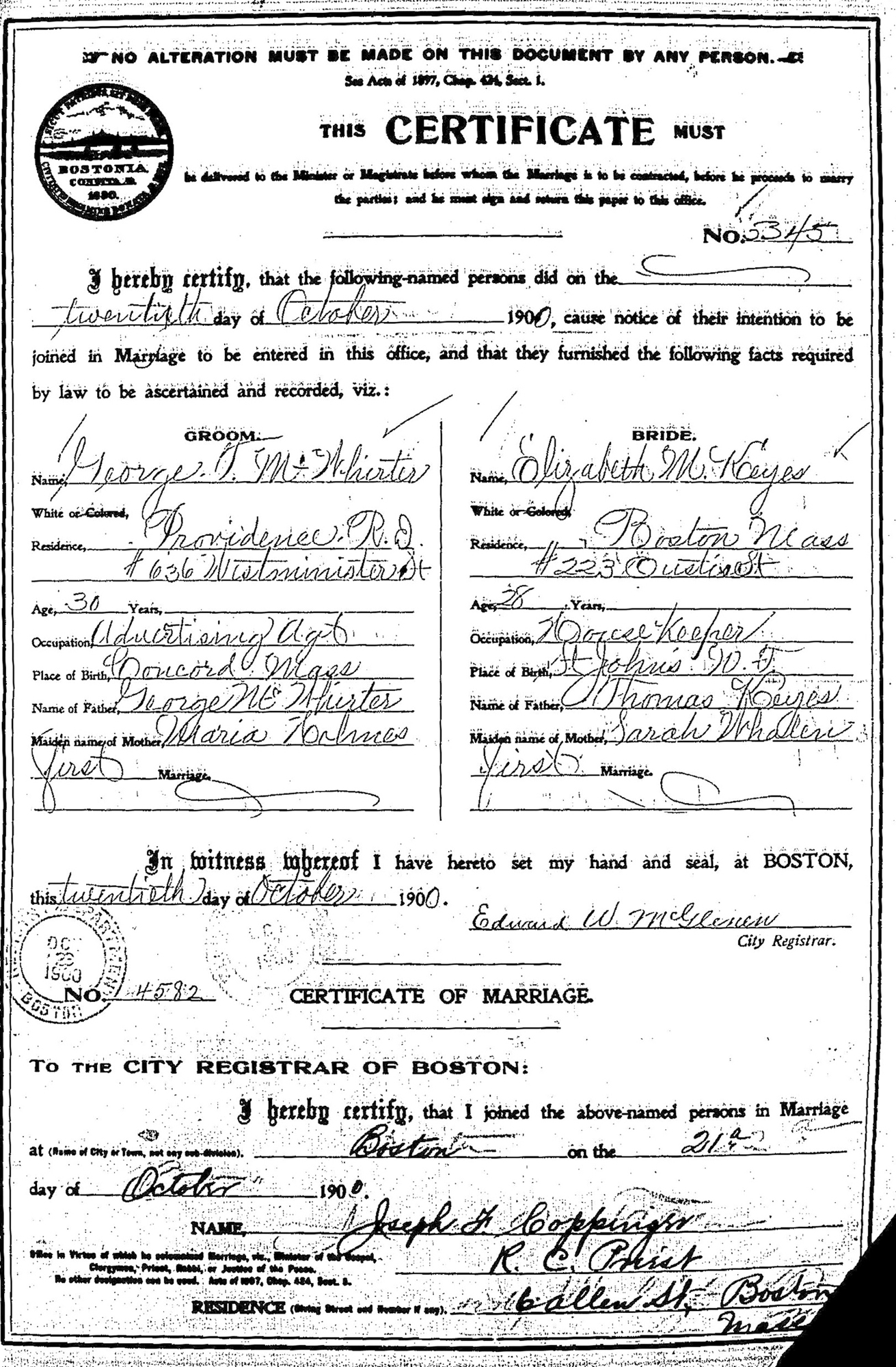 • Marriage Image: 21 October 1900, in Boston, MA. 1