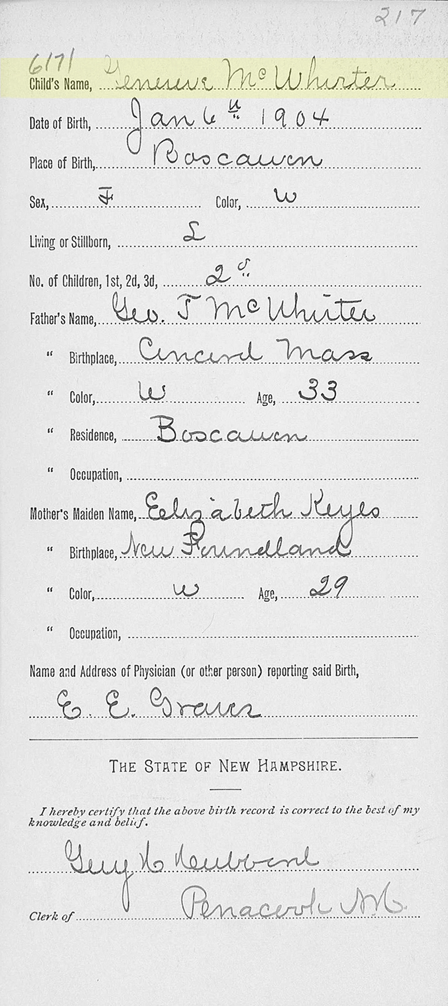 Citing this Record "New Hampshire Birth Certificates, 1901-1915," database with images, FamilySearch (https://familysearch.org/ark:/61903/1:1:Q2SD-DDFP : 15 March 2018), Elizabeth Keyes in entry for Geneieve McWhirter, 06 Jan 1904, Boscawen, Merrimack, New Hampshire, United States; citing ref. ID #6171, New Hampshire Division of Vital Records, Concord; FHL microfilm 5,576,119. ------------------------------------------