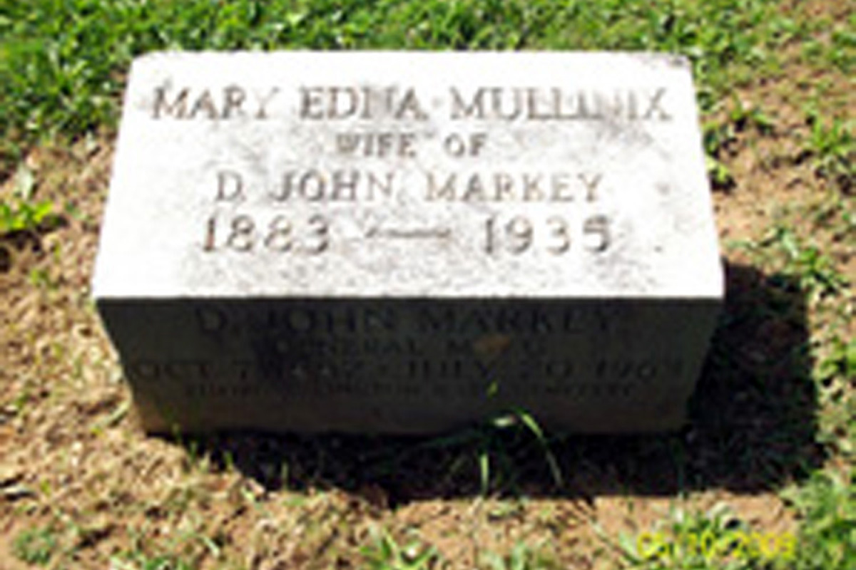 5 Find A Grave, database and images (https://www.findagrave.com/ ); accessed 9 April 2019), memorial page for Mary Edna Mullinix Markey (1883\endash 1935), Find A Grave Memorial no. 39888737, citing Mount Olivet Cemetery, Frederick, Frederick County, Maryland, USA