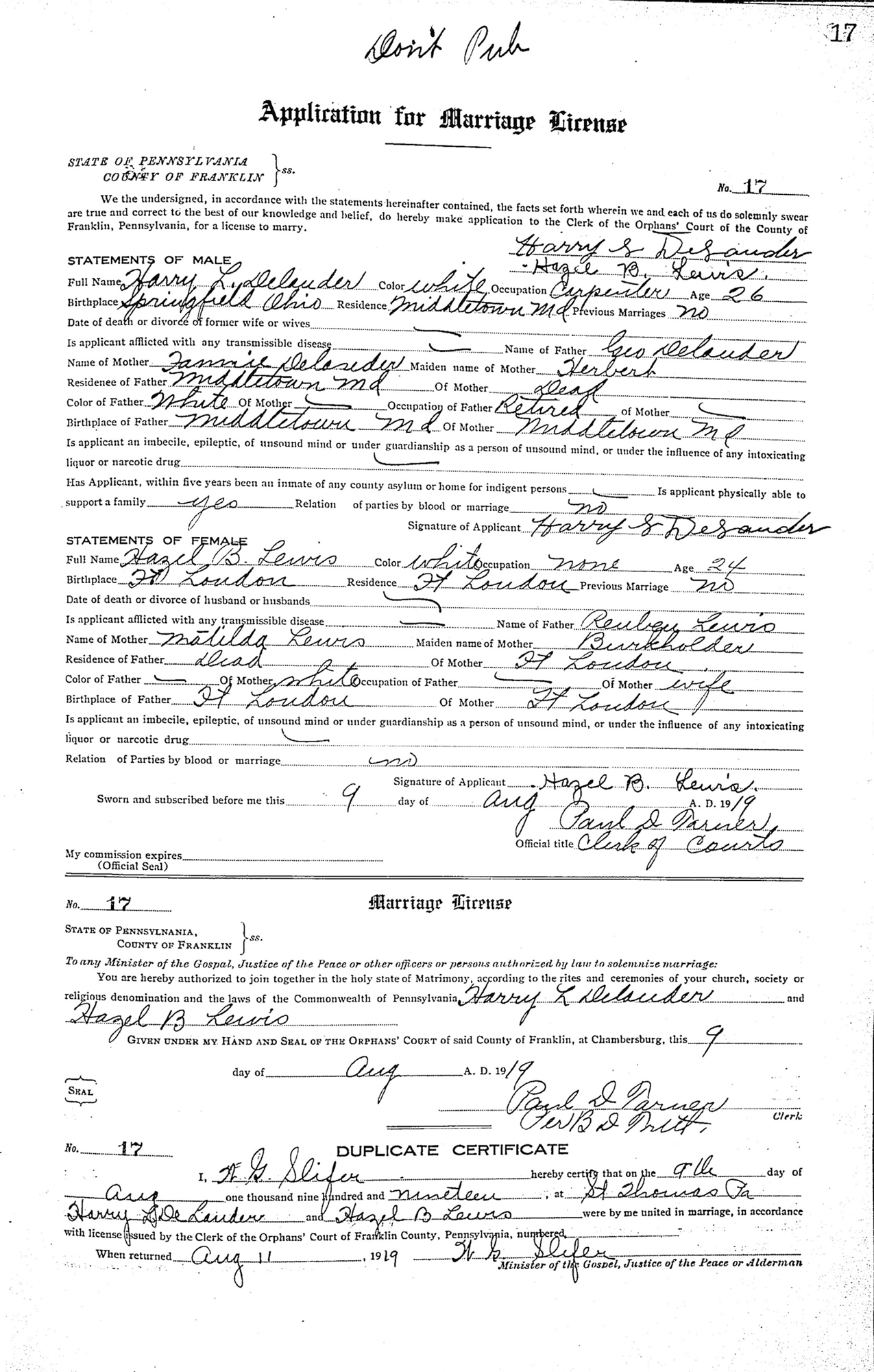 1 "Pennsylvania, County Marriages, 1885-1950," database with images, FamilySearch (accessed 18 Dec 2019); Harry L. Delauder and Hazel B. Lewis, 09 Aug 1919; citing Marriage, St Thomas, Franklin, Pennsylvania, United States, multiple County Clerks, Pennsylvania.