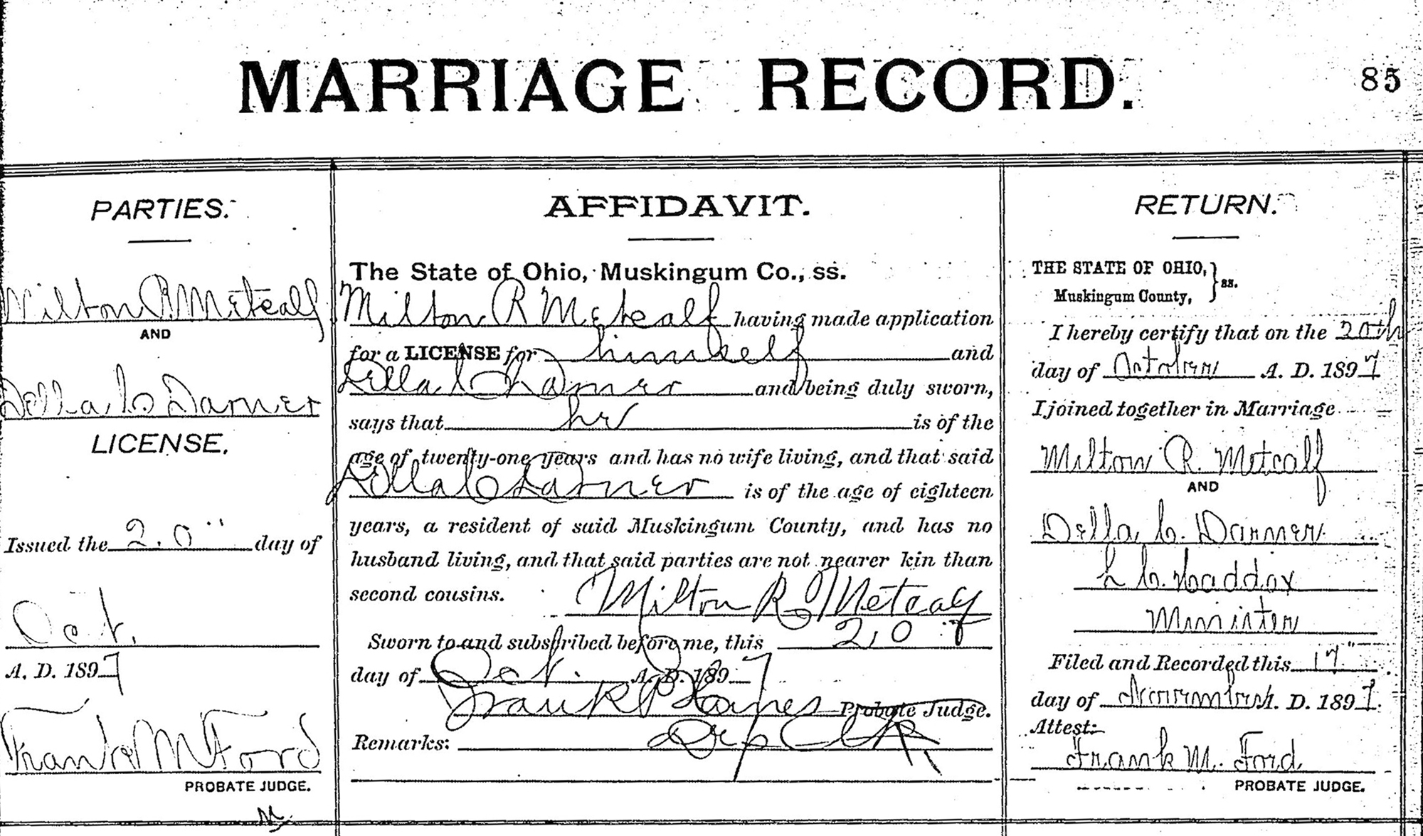 1 "Ohio, County Marriages, 1789-2016," database with images, FamilySearch.org (accessed 25 Feb 2014); Name: Milton R. Metcalf; Spouse's Name: Della C. Darner; Event Date: 20 Oct 1897; Event Place: Muskingum, Ohio.
