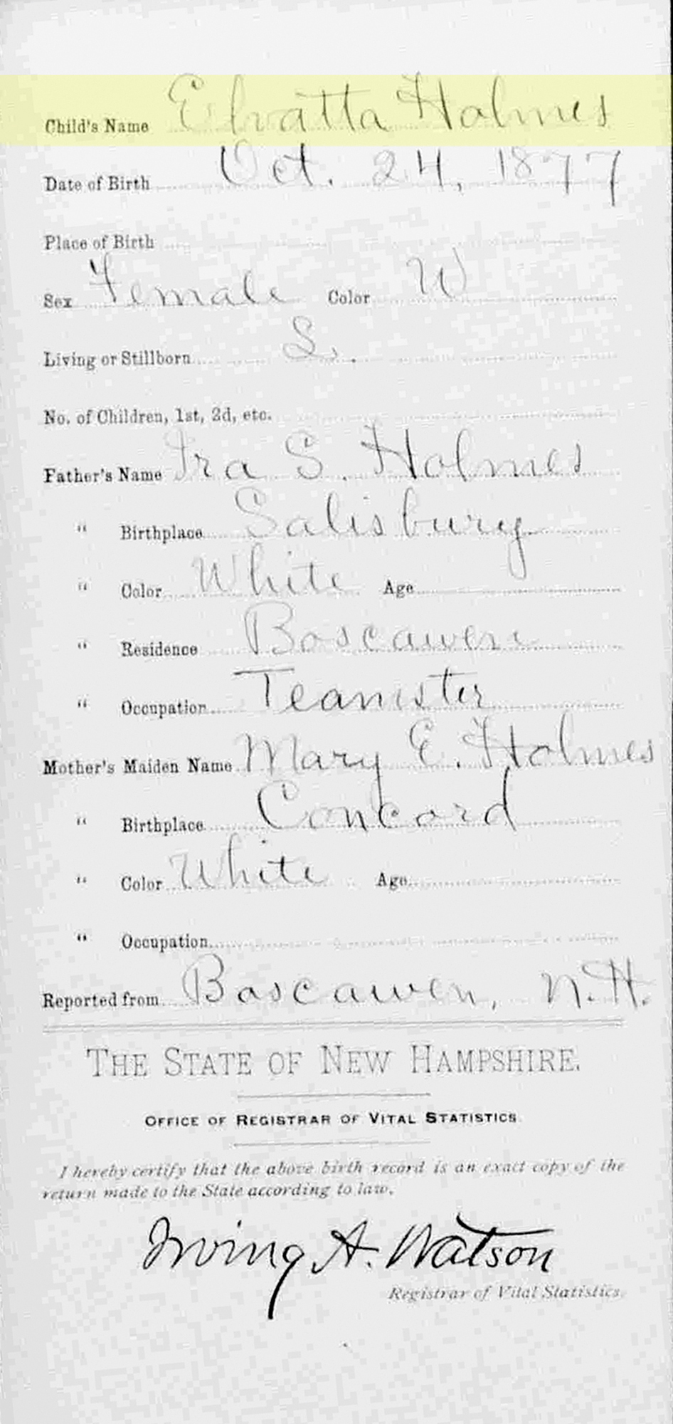 7 "New Hampshire Birth Records, Early to 1900," database with images, FamilySearch (https://www.familysearch.org/search/collection/1542861 : accessed 19 Apr 2020), Elvatta Holmes, 24 Oct 1877; citing Boscawen, Merrimack, New Hampshire, United States, Bureau of Vital Records and Health Statistics, Concord; FHL microfilm 1,001,002.