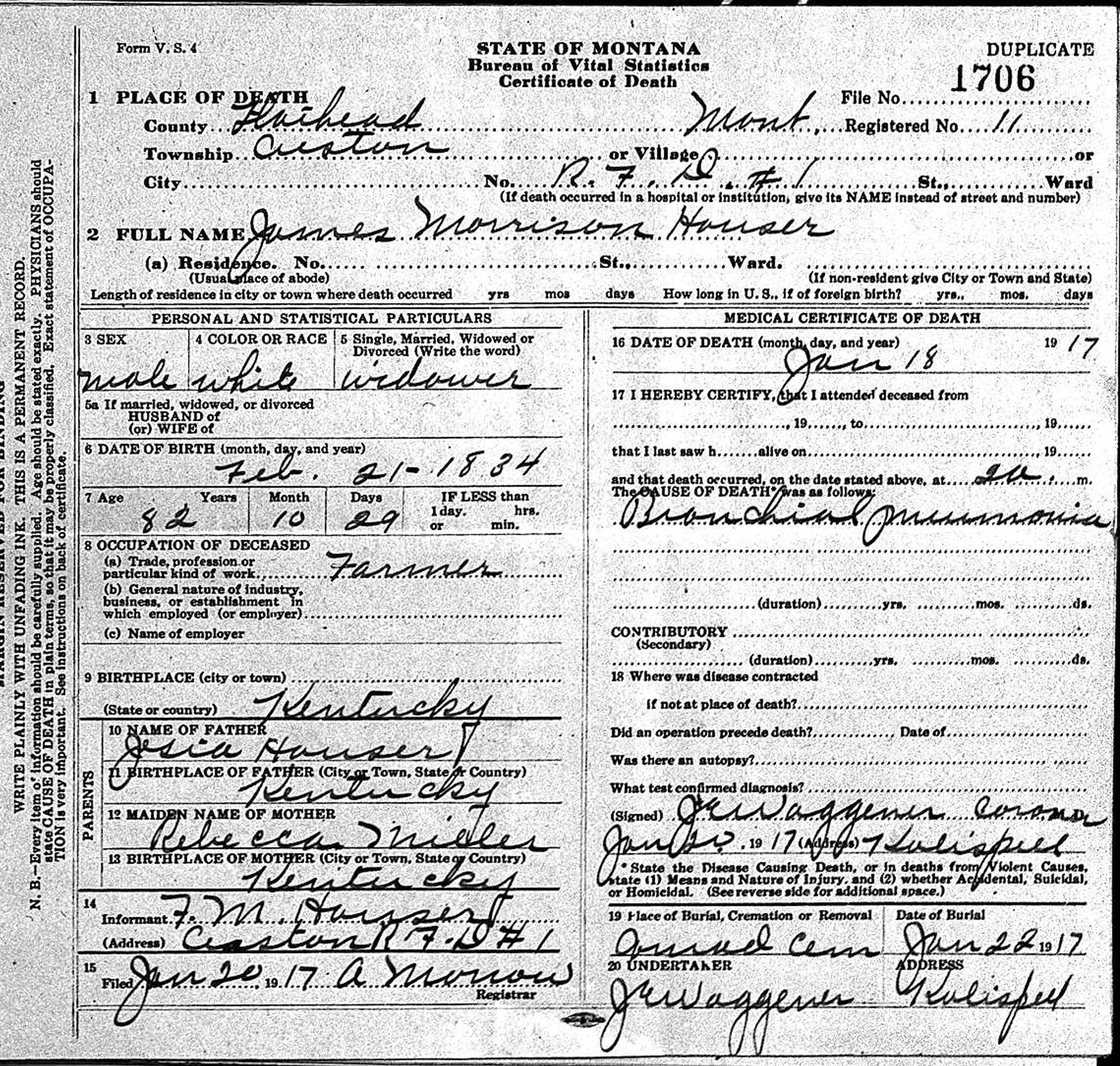 • Death Image: 18 January 1917, in Creston, MT. James married Mathilda Moyer, daughter of Philip Moyer and Unknown, about 1856. (Mathilda Moyer was born on 25 May 1828 in Ohio and died on 24 February 1869 in , Logan County, IL.)