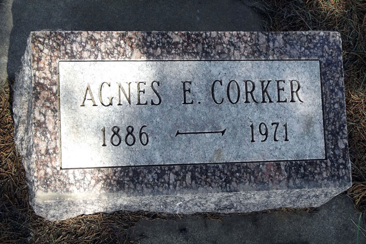 Find A Grave, database and images (https://www.findagrave.com/ ); Find a Grave, database and images (https://www.findagrave.com : accessed 04 January 2021), memorial page for Agnes E. Corker (20 May 1886\endash 4 Nov 1971), Find a Grave Memorial no. 117350287, citing Plankinton Cemetery, Plankinton, Aurora County, South Dakota, USA ; Maintained by LezleeO (contributor 47734262) .