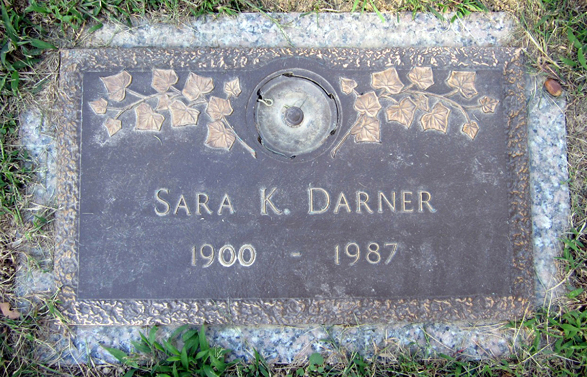 • She was buried in 1987 in the Columbia Gardens in Arlington, VA. Sara married Francis William Darner, son of Francis William Darner and Clara Theresia Kuehlkopf, on an unknown date. (Francis William Darner was born on 15 May 1902 in Ottumwa, IA,2 3 4 5 died on 26 August 1959 in Washington, DC 5 and was buried after 26 August 1959 in Arlington, VA 5.) |