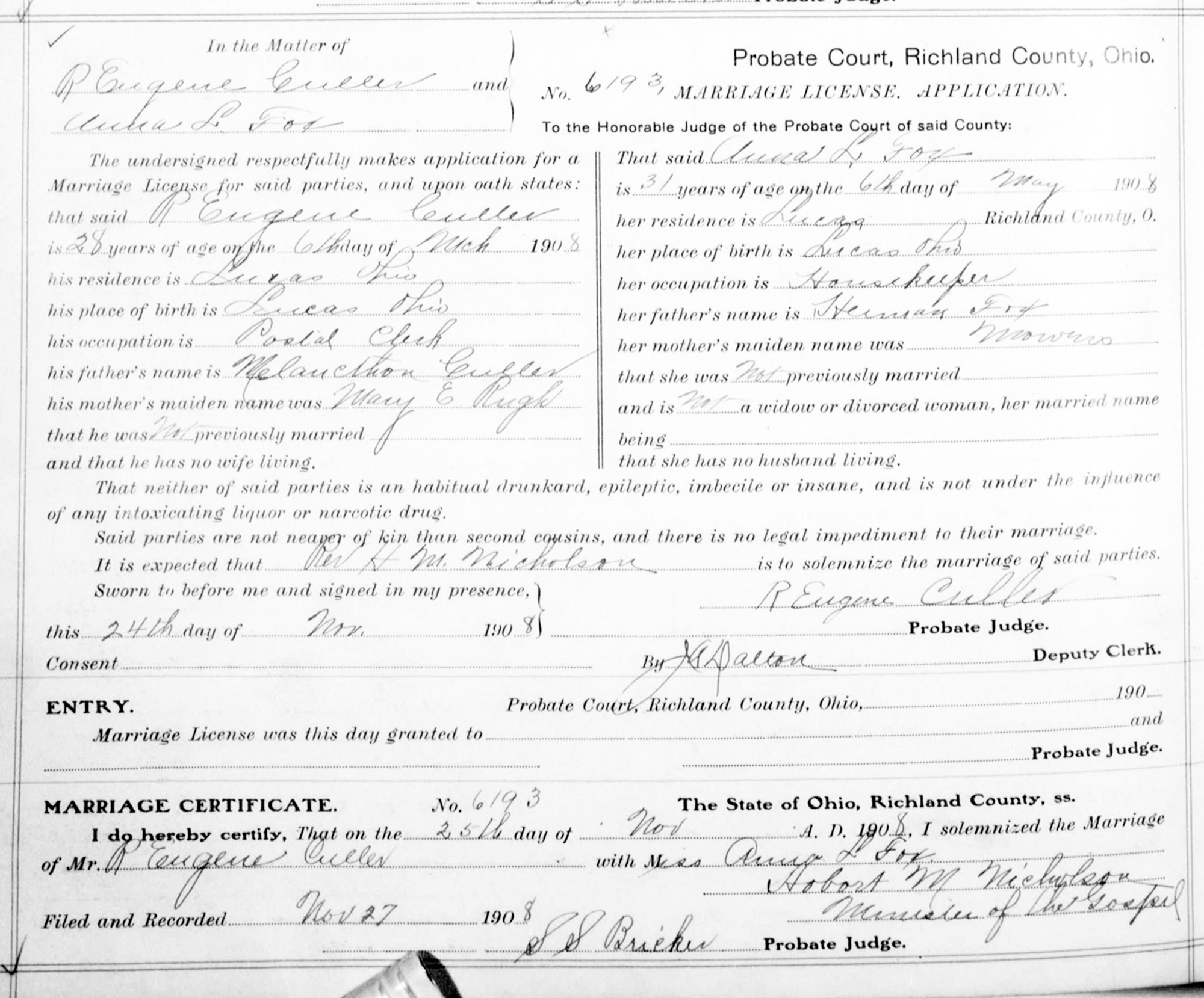 • Marriage Image: 25 November 1908, in , Richland County, OH.