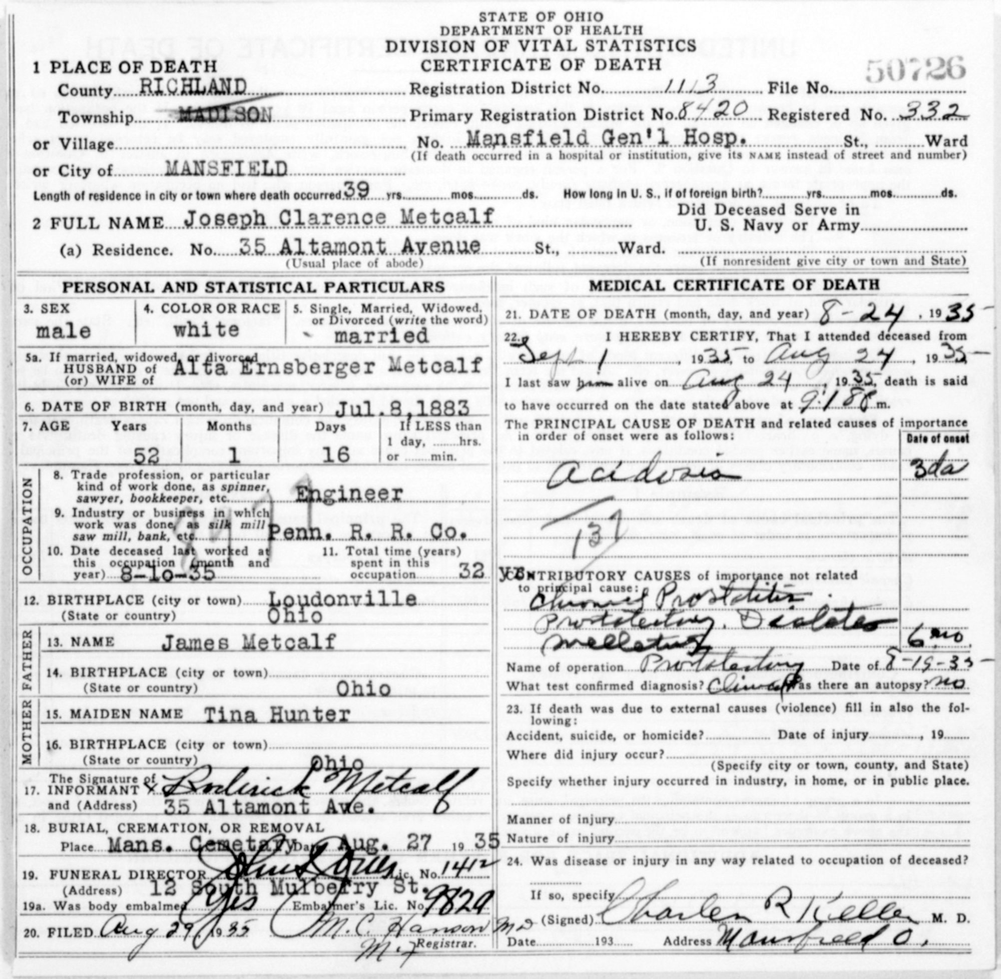 Citing this Record "Ohio Deaths, 1908-1953," database with images, FamilySearch (https://familysearch.org/ark:/61903/1:1:X6WV-1BR : 8 March 2018), Joseph Clarence Metcalf, 24 Aug 1935; citing Mansfield, Richland, Ohio, reference fn 50726; FHL microfilm 2,022,525. ------------------------------------