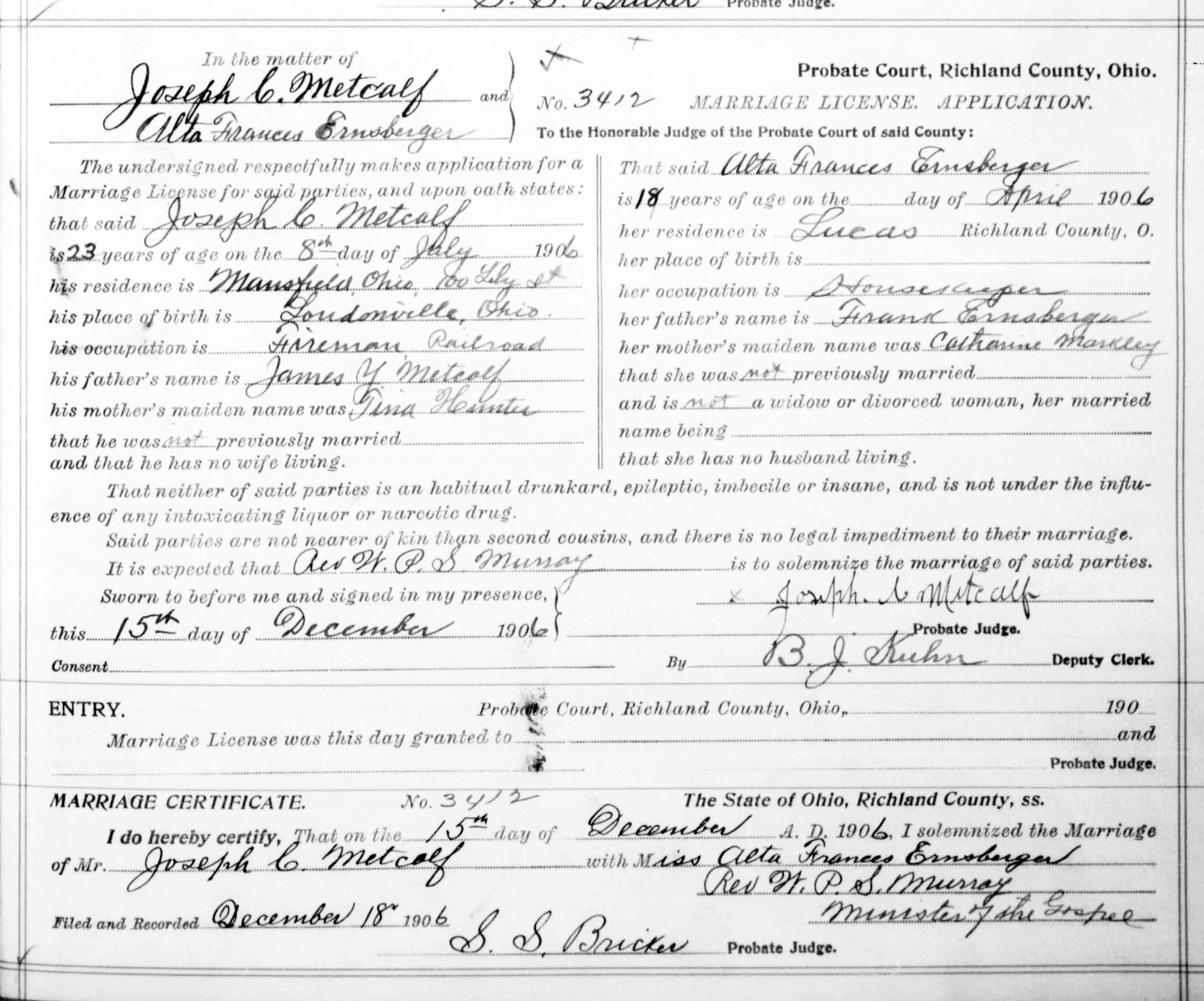 • Marriage Image: 15 December 1906, in , Richland County, OH.