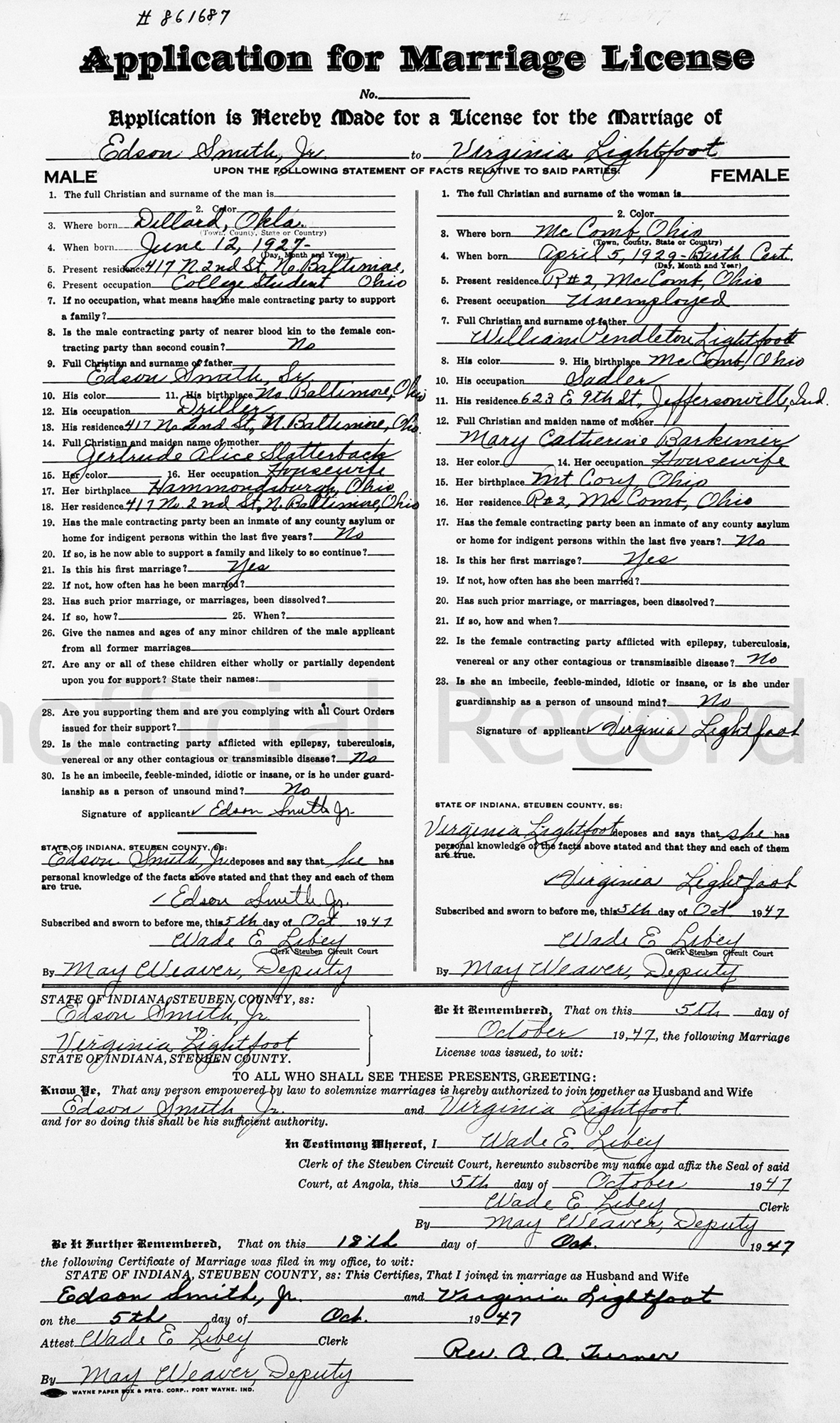 1 "Indiana Marriages, 1811-2019," database with images, FamilySearch (accessed 2 Jun 2014); Name: Edson Smith; Spouse's Name: Virginia Lightfoot; Event Date: 05 Oct 1947; Event Place:, Steuben, Indiana.