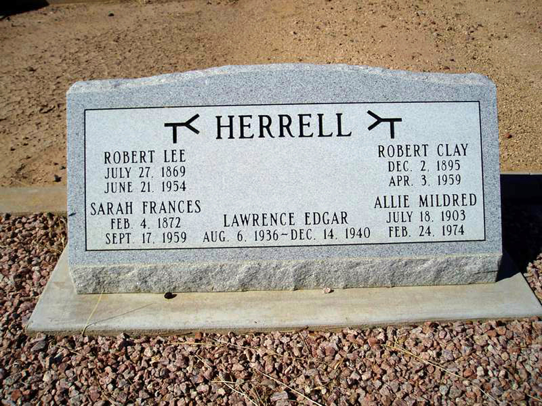 4 Find A Grave, database and images (https://www.findagrave.com/ ); accessed 21 December 2018), memorial page for Robert Lee Herrell (27 Jul 1869\endash 21 Jun 1954), Find A Grave Memorial no. 32123943, citing Tempe Double Butte Cemetery, Tempe, Maricopa County, Arizona, USA