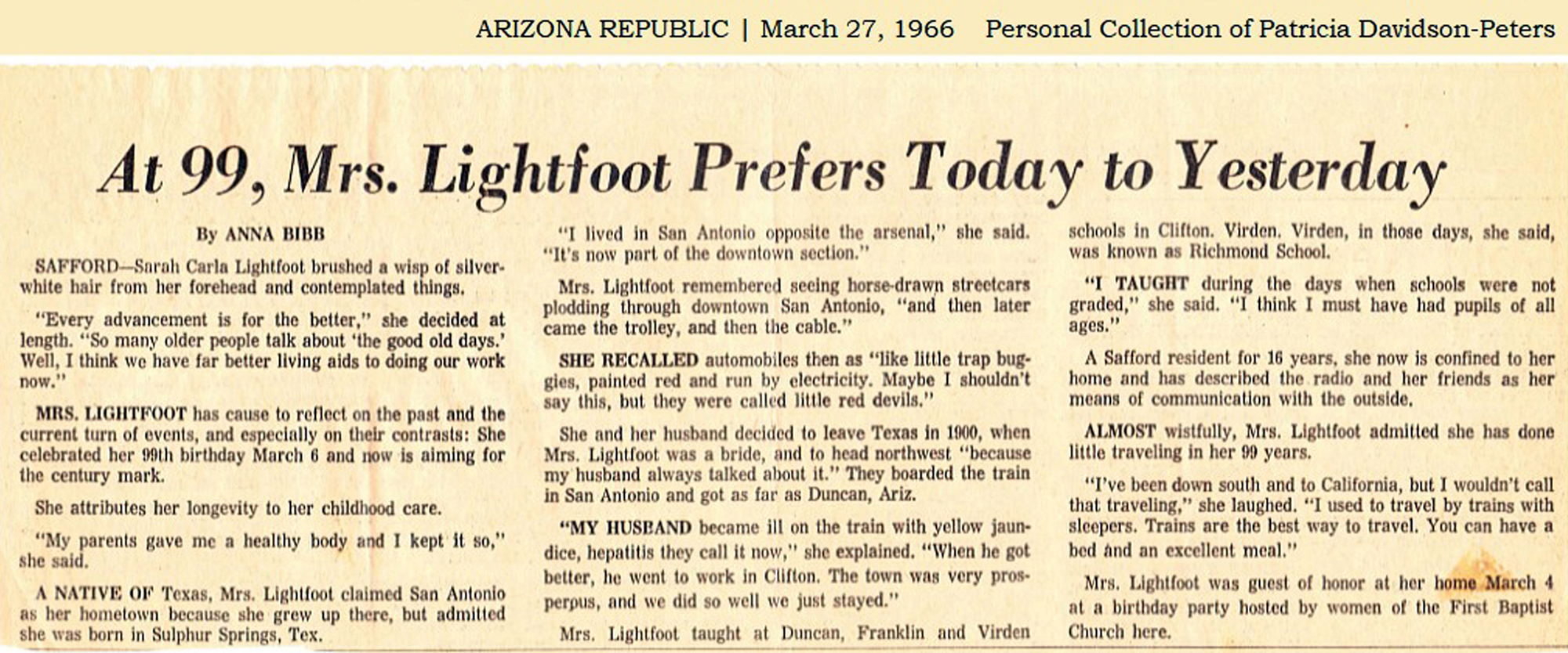 • Personality/Intrst: Arizona Republic, 27 March 1966, Phoenix, AZ. A human interest article was published entitled "At 99, Mrs. Lightfoot Prefers Today to Yesterday". In the article she recalls a historical description of the events of her life.