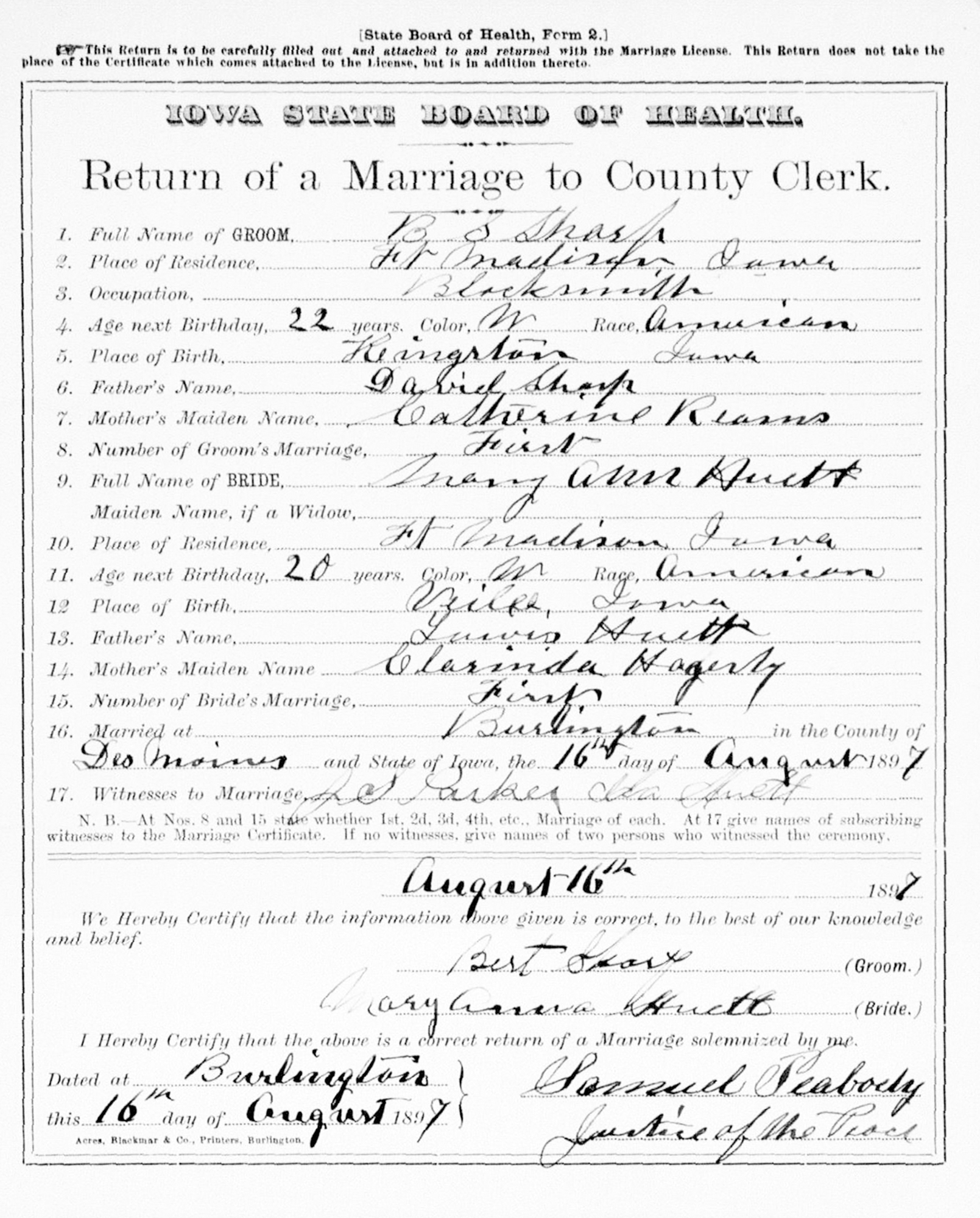 1 "Iowa, County Marriages, 1838-1934," database, FamilySearch (https://familysearch.org/search/collection/1805551 : accessed 7 Aug 2019), B. S. Sharp and Mary Ann Huett, 16 Aug 1897, Burlington, Des Moines, Iowa; citing reference, county courthouses, Iowa; FHL microfilm 1,682,869.