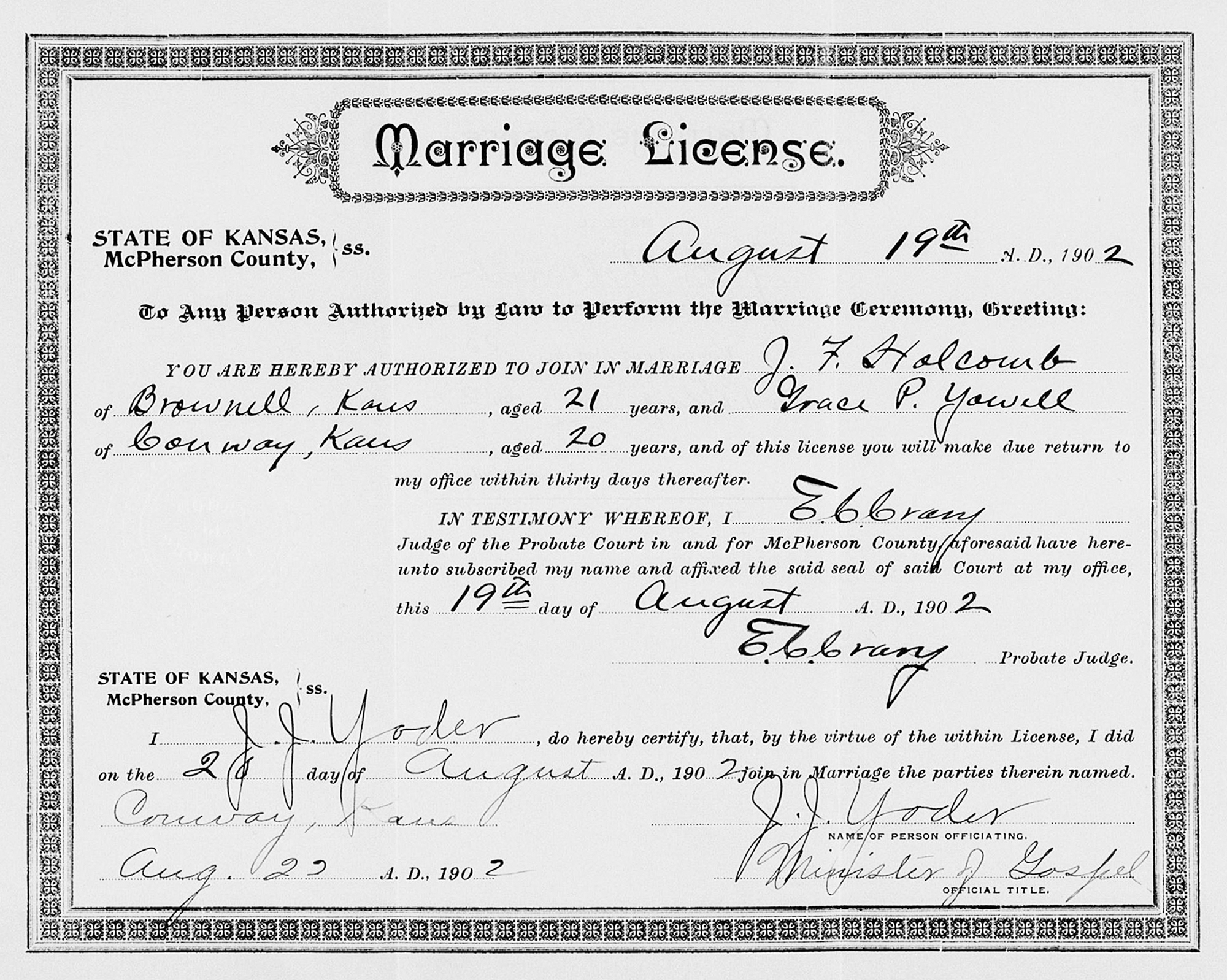 1 "Kansas County Marriages, 1855-1911," database with images, FamilySearch (https://www.familysearch.org/search/collection/1851040 : accessed 15 Aug 2019), J F Holcomb and Grace P Yowell, 20 Aug 1902; citing Marriage, McPherson, Kansas, United States, district clerk, court clerk, county clerk and register offices from various counties; FHL microfilm 2,297,899.