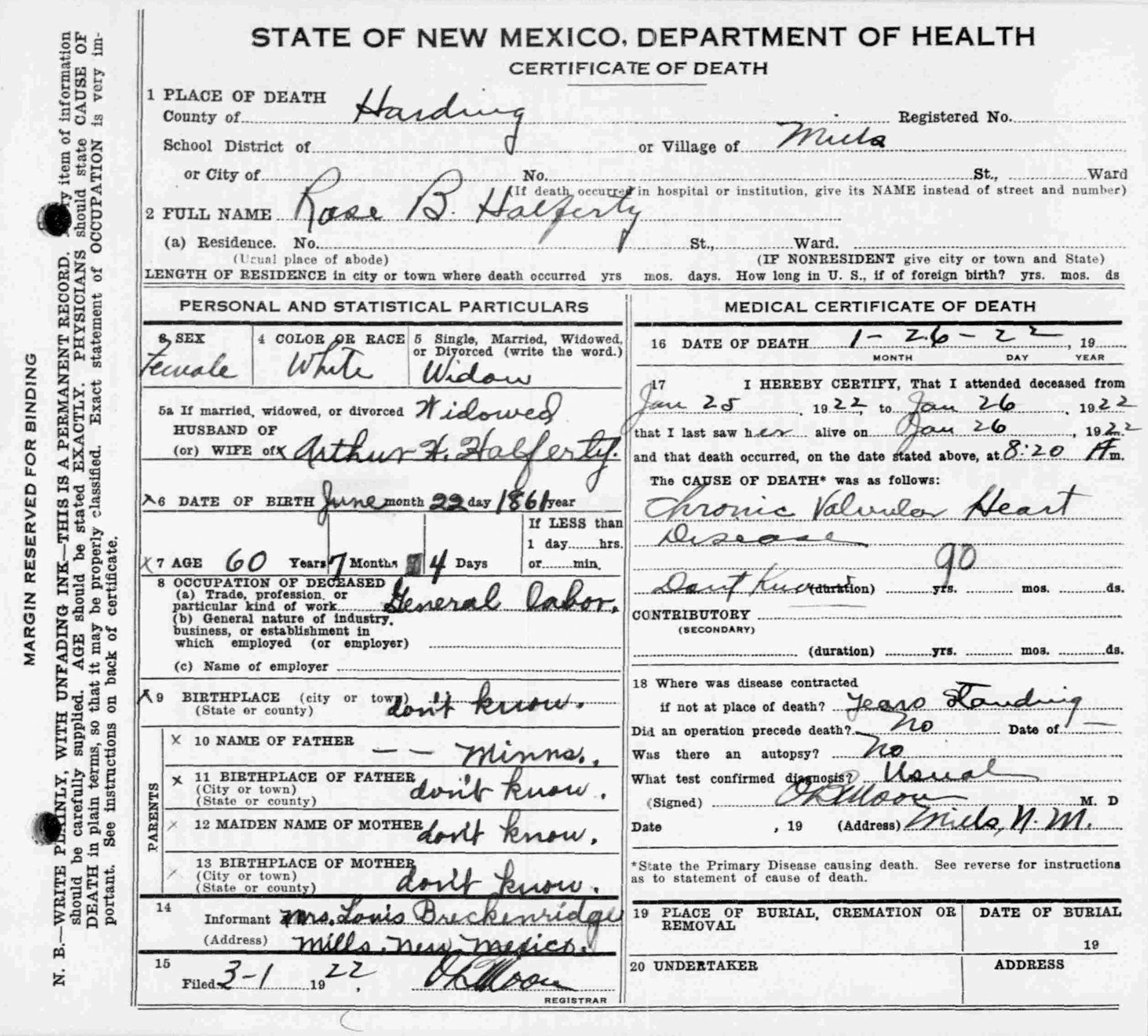 6 "New Mexico Deaths, 1889-1945," database, FamilySearch (https://www.familysearch.org/search/collection/1546466 : accessed 15 Aug 2019), Rose B. Halferty, 26 Jan 1922; citing Mills, Harding, New Mexico, reference, Bureau of Vital Records and Health Statistics, Santa Fe; FHL microfilm 2,032,885.