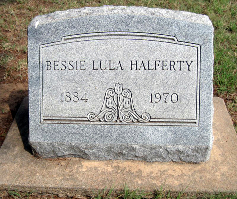 6 Find A Grave, database and images (https://www.findagrave.com/ ); (accessed 18 August 2019), memorial page for Bessie Lula Minter Halferty (21 Nov 1884\endash Sep 1970), Find A Grave Memorial no. 29679079, citing Caldwell City Cemetery, Caldwell, Sumner County, Kansas, USA