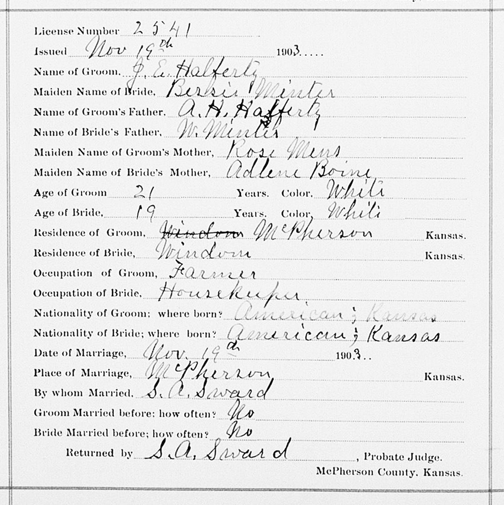 1 "Kansas County Marriages, 1855-1911," database with images, FamilySearch (https://www.familysearch.org/search/collection/1851040 : accessed 15 Aug 2019), J E Halferty and Bessie Minter, 19 Nov 1903; citing Marriage, McPherson, Kansas, United States, district clerk, court clerk, county clerk and register offices from various counties; FHL microfilm 2,319,899.