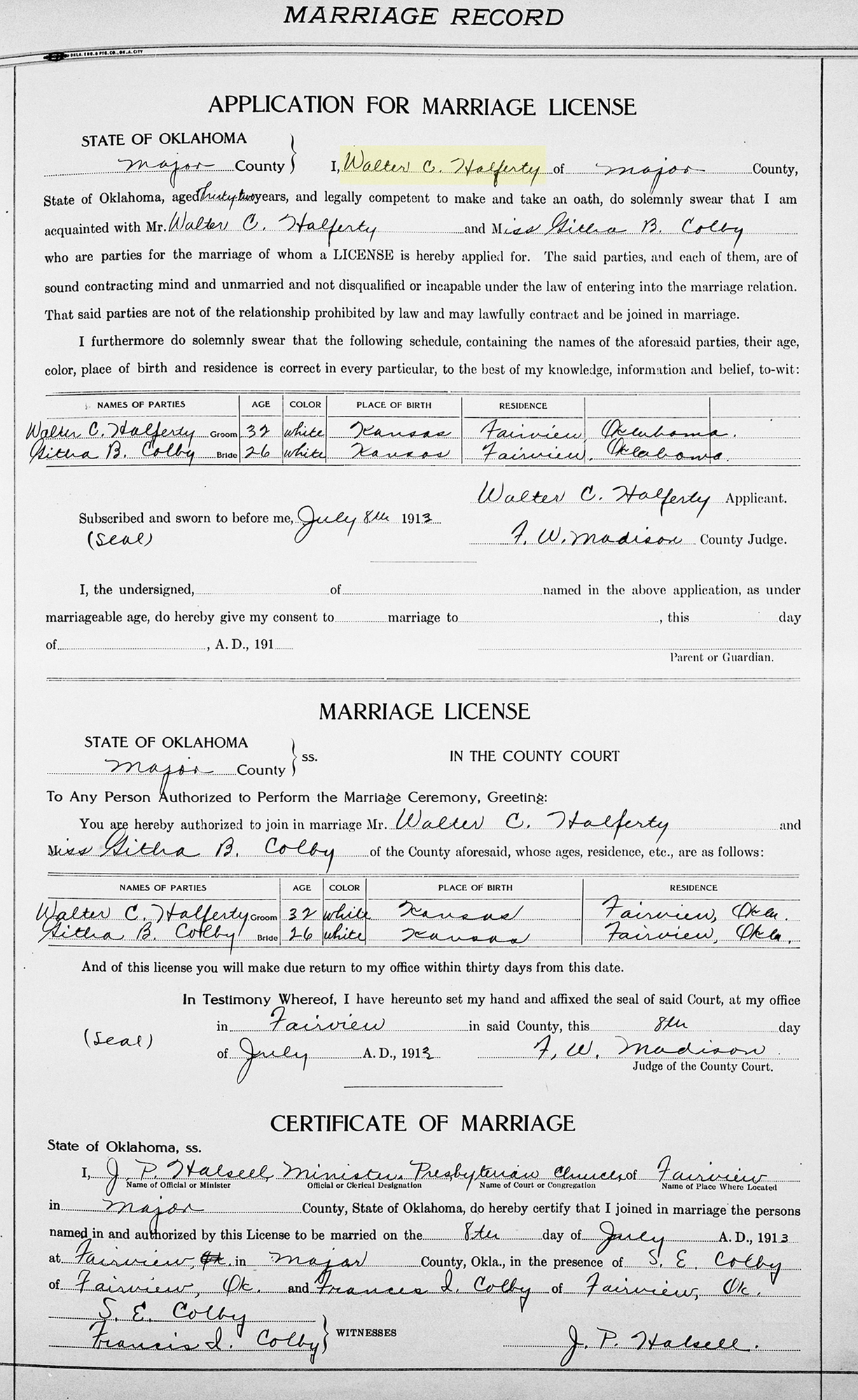 1 "Oklahoma, County Marriages, 1890-1995," database with images, FamilySearch (https://familysearch.org/search/collection/1709399 : accessed 17 Aug 2019); Walter C Halferty and Githa B Colby, 08 Jul 1913; citing Oklahoma, various county courthouses, Oklahoma; FHL microfilm.