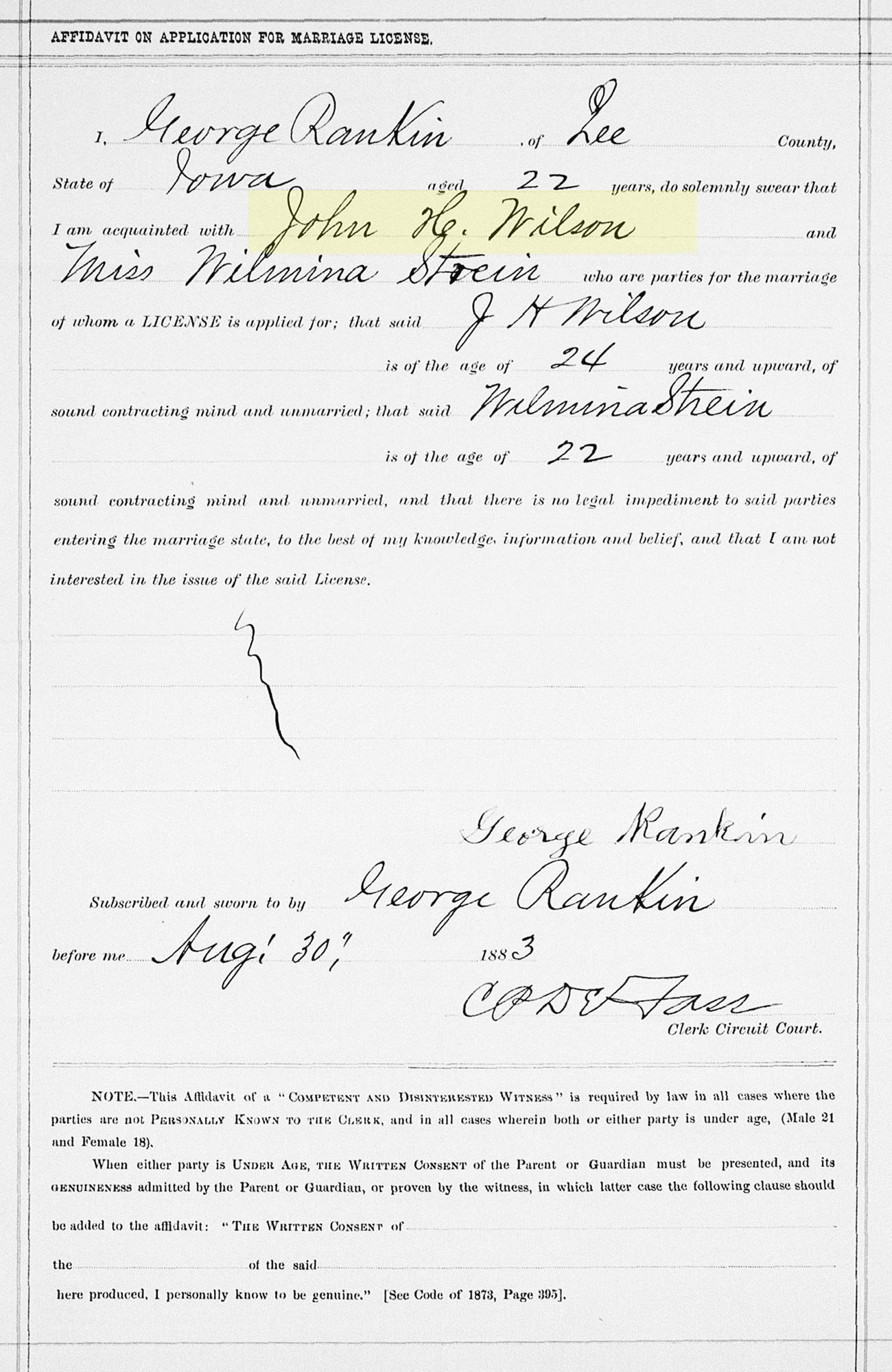 1 "Iowa, County Marriages, 1838-1934," database, FamilySearch (https://familysearch.org/search/collection/1805551 : accessed 24 Aug 2019), John H Wilson and Wilmina Strein, 30 Aug 1883, Des Moines, Iowa; citing reference, county courthouses, Iowa; FHL microfilm 1,683,031.