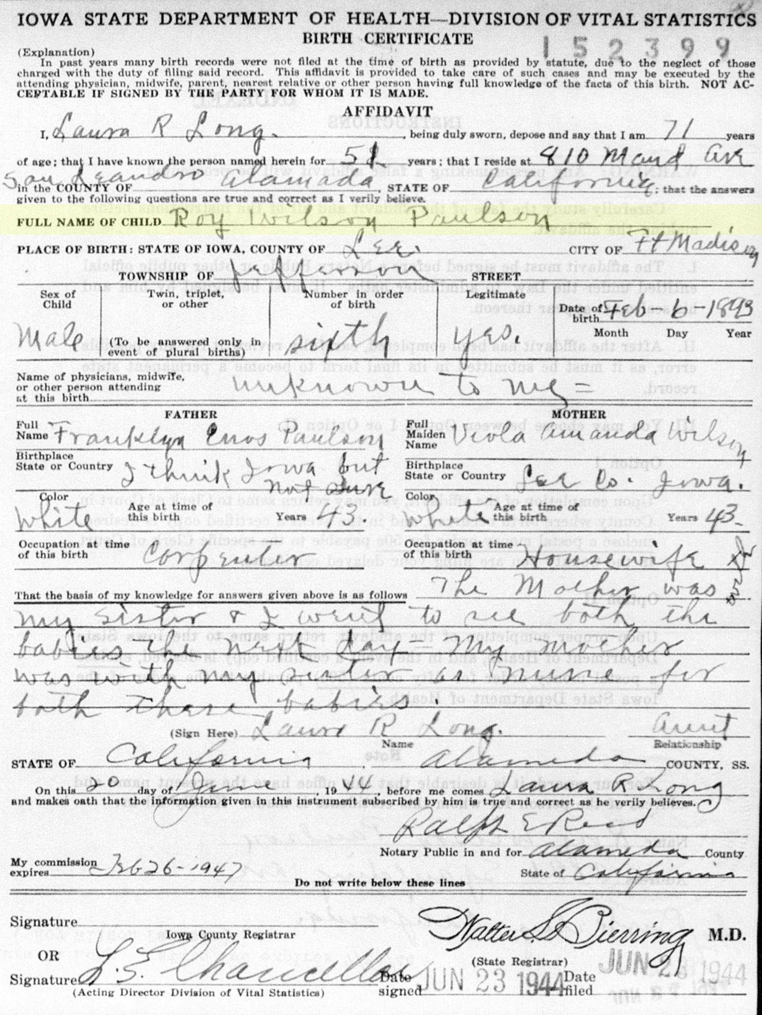 1 "Iowa, Delayed Birth Records, 1850-1939," database with images, FamilySearch (https://www.familysearch.org/search/collection/2527591 : accessed 23 Aug 2019), Roy Wilson Paulson, 06 Feb 1893, Fort Madison, Lee, Iowa; citing reference ID 152399, State Historical Society of Iowa, Des Moines; FamilySearch digital folder 101713547.