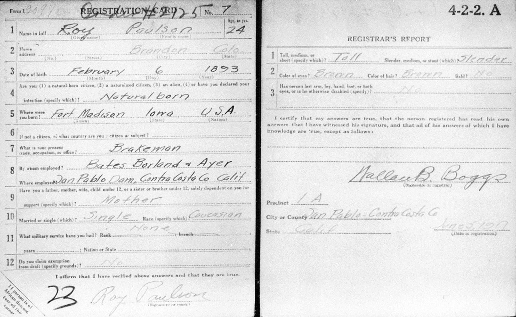 7 "United States World War I Draft Registration Cards, 1917-1918," database with images, FamilySearch.org (accessed 23 Aug 2019); Roy Paulson, 1917-1918; citing Contra Costa County no 2, California, United States, NARA microfilm publication M1509 (Washington D.C.: National Archives and Records Administration, n.d.); FHL microfilm 1,530,712.