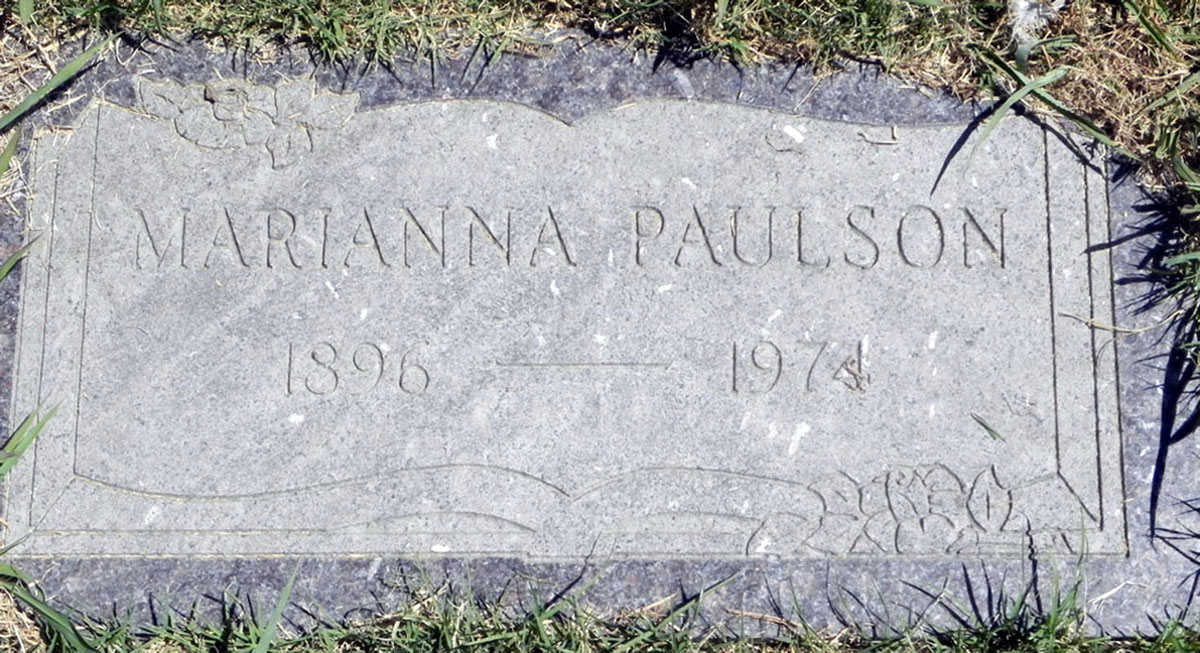 Find A Grave, database and images (https://www.findagrave.com/ ); (accessed 23 August 2019), memorial page for Marianna Paulson (1896\endash 1974), Find A Grave Memorial no. 75728384, citing Oak Hill Memorial Park, San Jose, Santa Clara County, California, USA