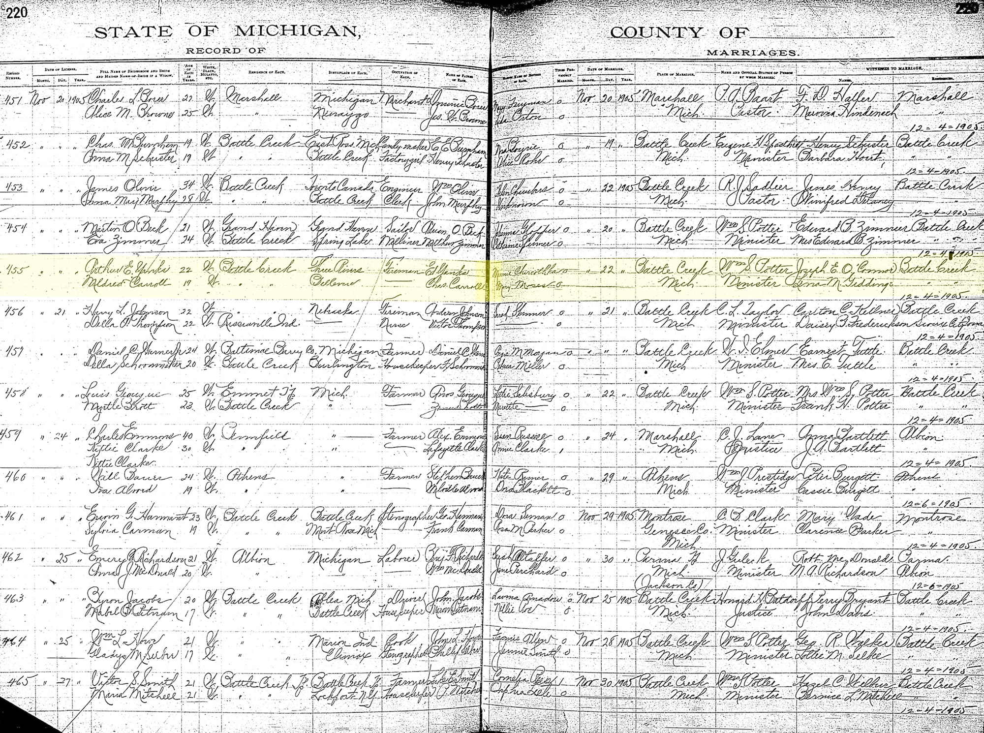 1 "Michigan, County Marriages, 1820-1940," database with images, FamilySearch.org (https://familysearch.org/search/collection/1810350 : accessed 30 Aug 2019); Arthur E. Yanka and Mildred Carroll, 22 Nov 1905; citing reference ID p220 rn455, various county clerks and libraries, Michigan; FHL microfilm 1,009,298.