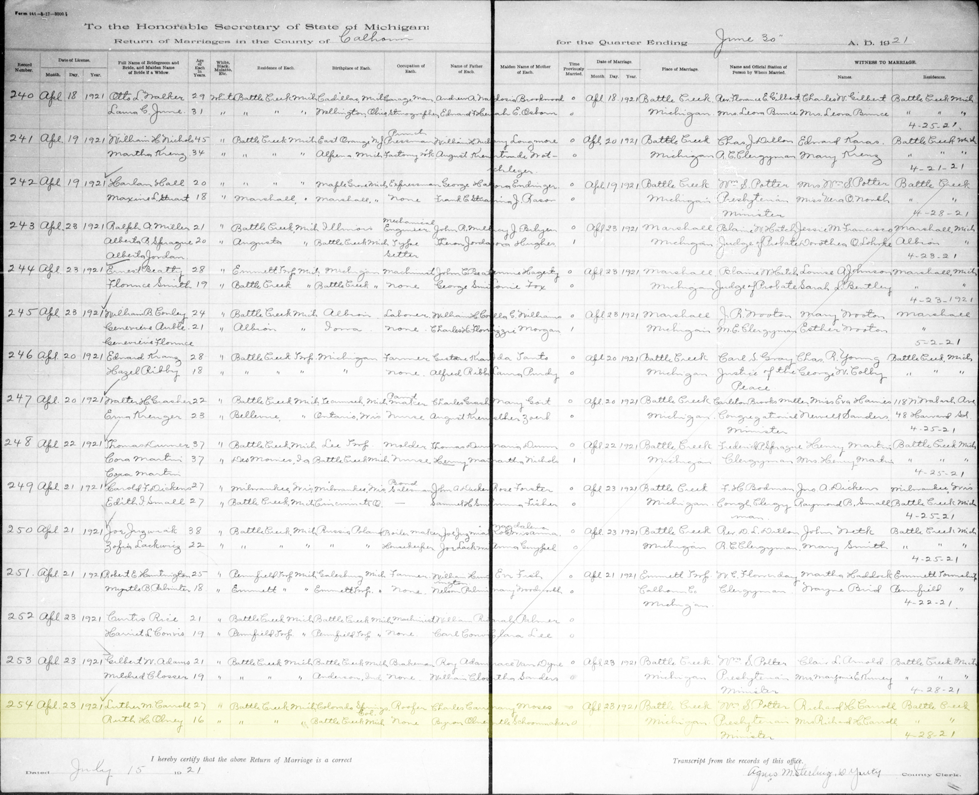 1 "Michigan Marriages, 1868-1925," database with images, FamilySearch (accessed 30 Aug 2019), Luther M. Carroll and Ruth H. Olney, 1921.