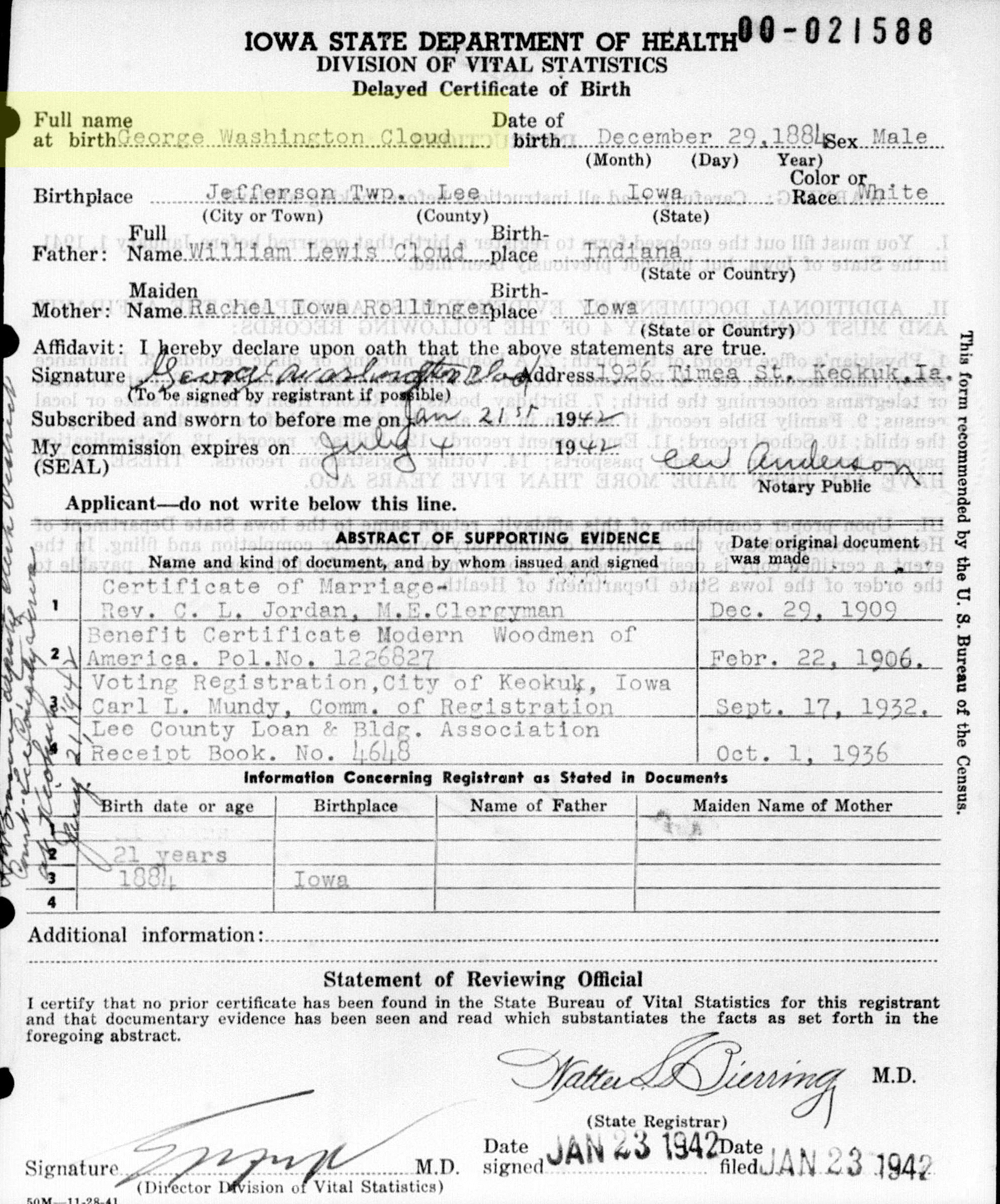 6 "Iowa, Delayed Birth Records, 1850-1939," database with images, FamilySearch (https://www.familysearch.org/search/collection/2527591 : accessed 14 Sep 2019), George Washington Cloud, 29 Dec 1884, Jefferson Township, Lee, Iowa, United States; citing reference ID 21588, State Historical Society of Iowa, Des Moines; FamilySearch digital folder 101693728.