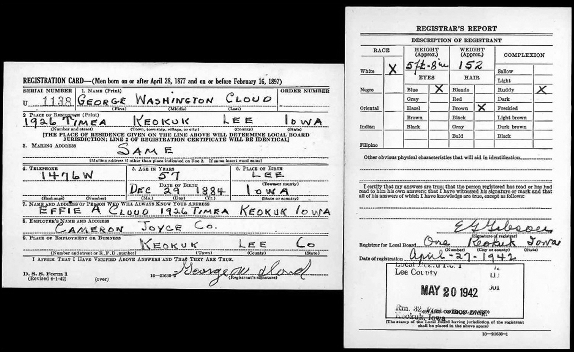 7 "United States World War I Draft Registration Cards, 1917-1918," database with images, FamilySearch.org (accessed 24 February 2021); George Washington Cloud, 1917-1918.