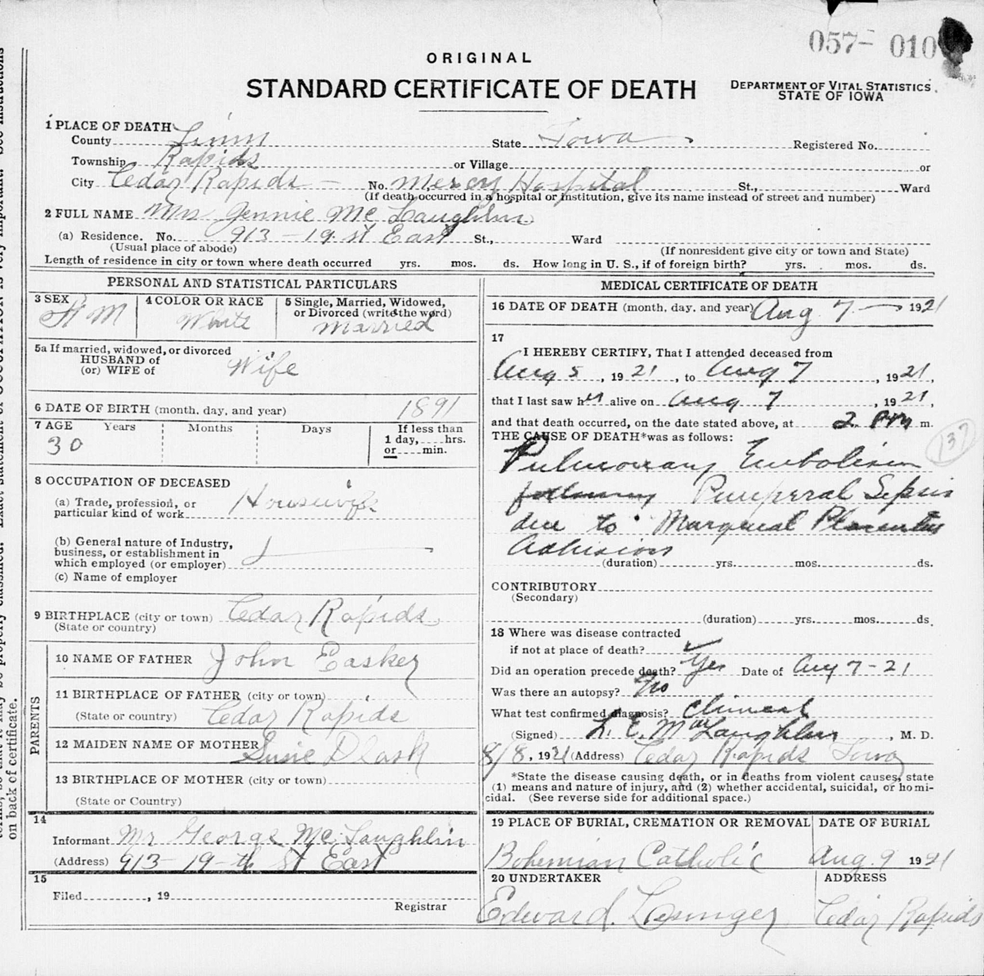 3 "Iowa, Death Records, 1904-1951," database with images, FamilySearch (https://www.familysearch.org/search/collection/2531337 : accessed 3 Oct 2019), Jennie Mclaughlin, 07 Aug 1921, Cedar Rapids, Linn, Iowa, United States; citing certificate #57010, State Historical Society of Iowa, Des Moines; FamilySearch digital folder 101784566.
