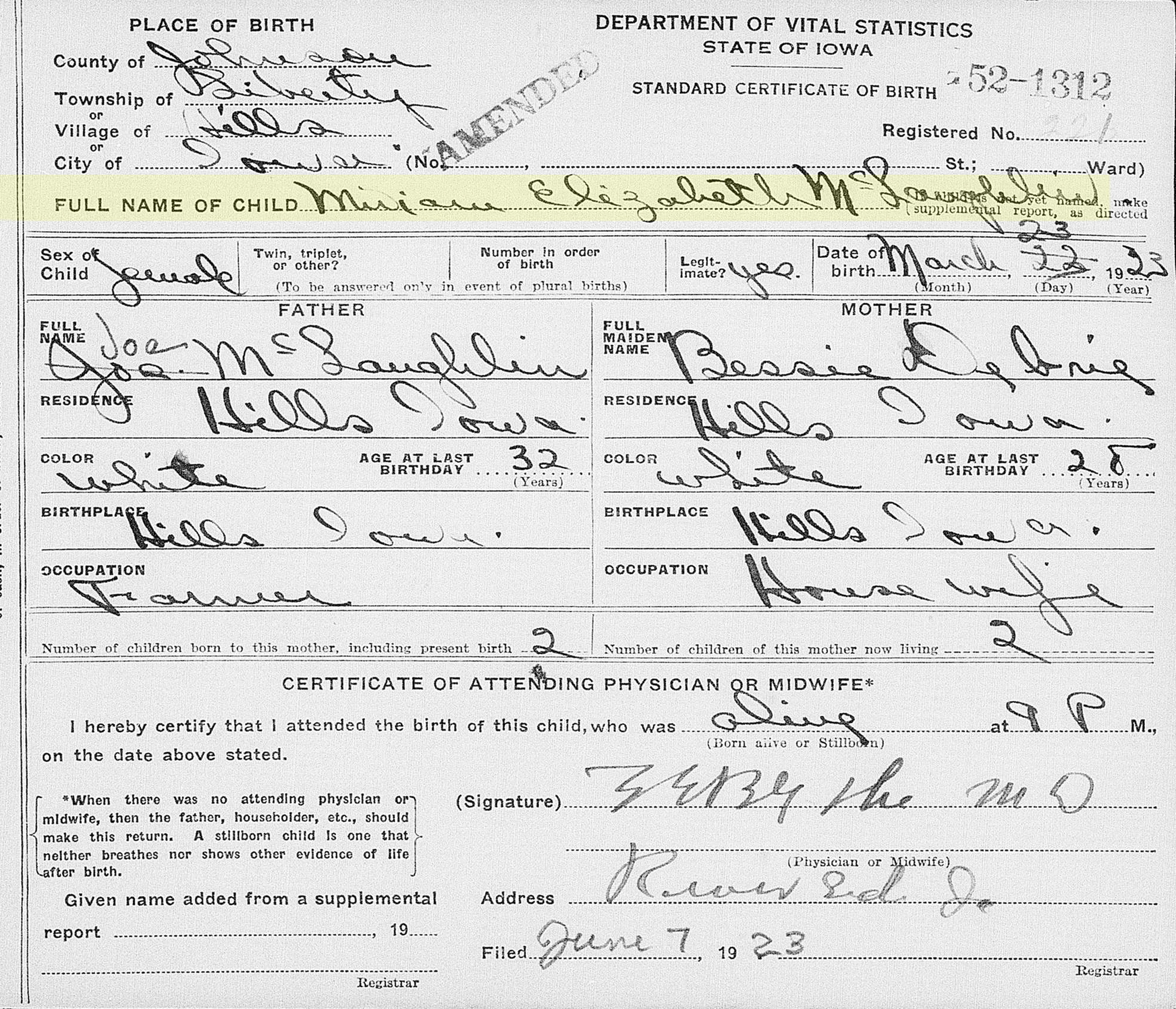 1 "Iowa, Birth Records, 1921-1942," database, FamilySearch (https://www.familysearch.org/search/collection/2849548 : accessed 5 Oct 2019), Miriam Elizabeth McLaughlin, 23 Mar 1923; citing Birth, Liberty Township, Johnson, Iowa, United States, State Historical Society of Iowa, Des Moines.